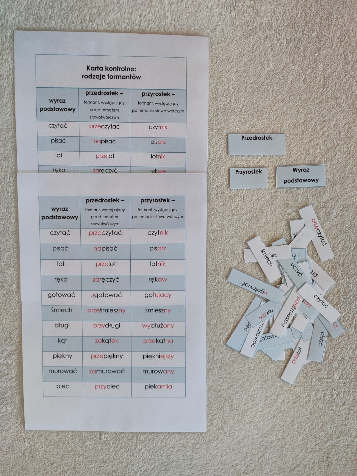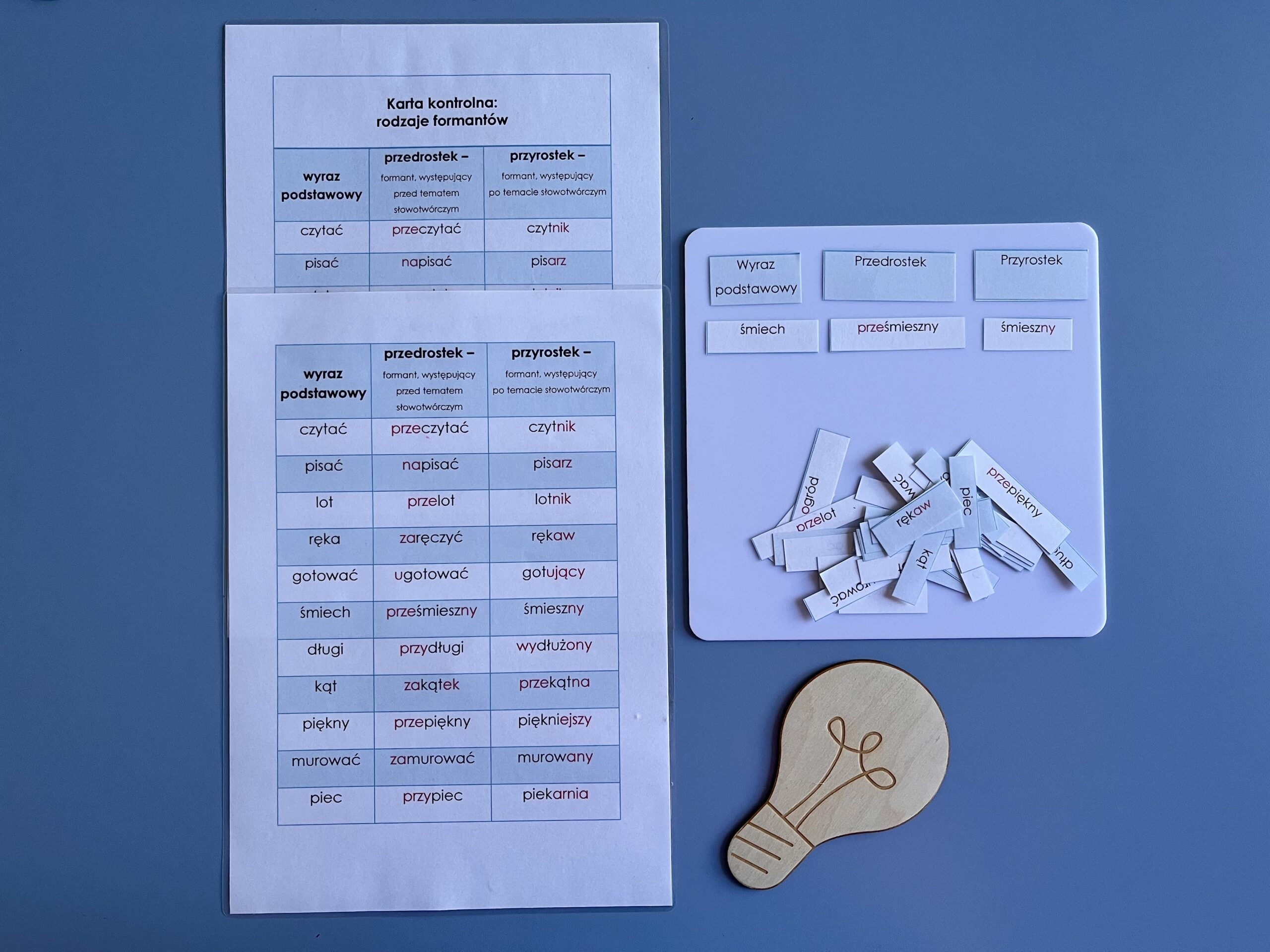 Zadaniem ucznia jest odpowiednio dopasować wyraz podstawowy, przedrostek i przyrostek. Uczeń utrwala sobie tutaj przede wszystkim różnicę pomiędzy przedrostkiem a przyrostkiem. Na karcie kontrolnej sprawdza poprawność wykonanego zadania.
