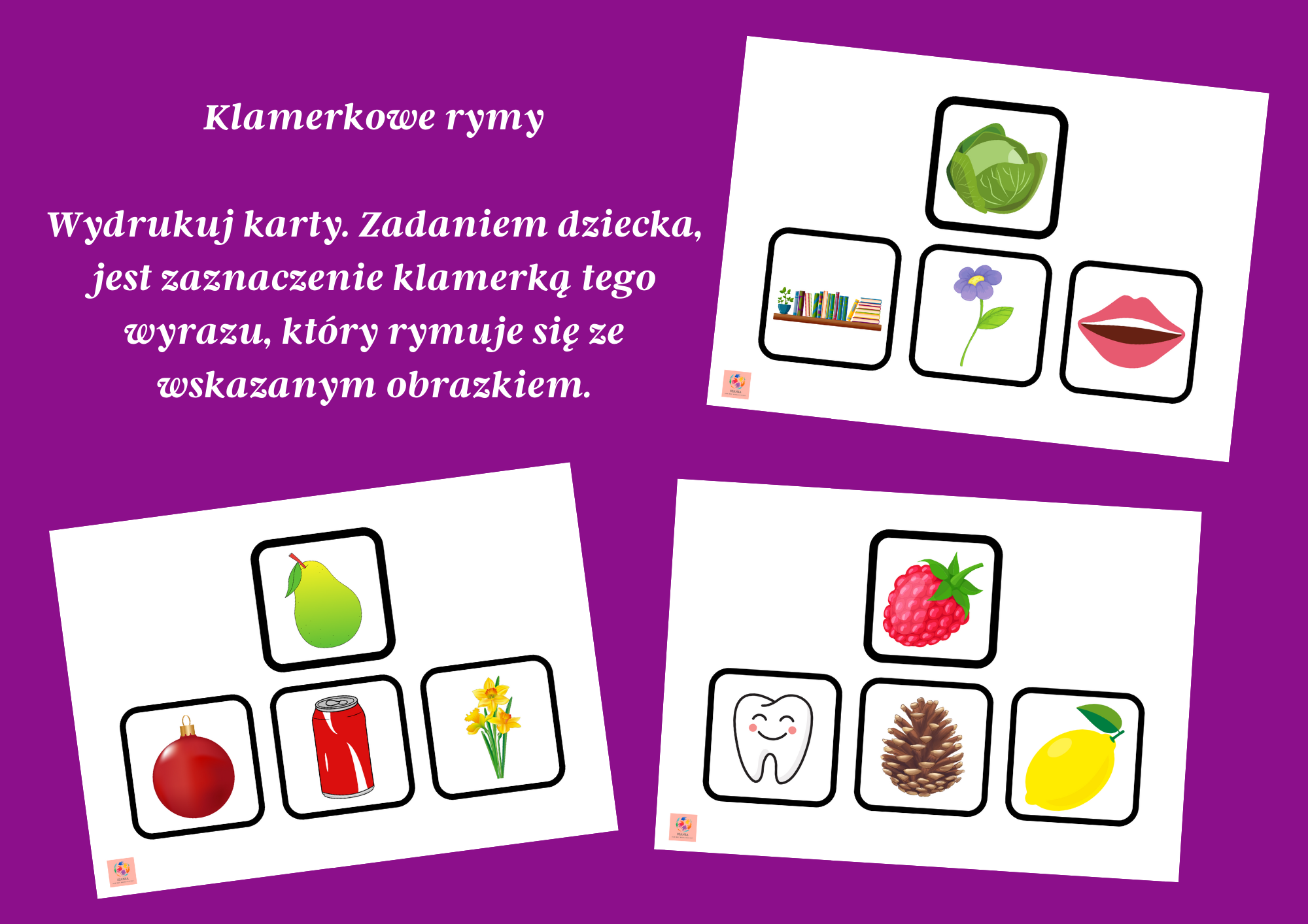 3) klamerkowe rymy - dziecko za pomocą klamerki zaznacza rymujący się wyraz.
