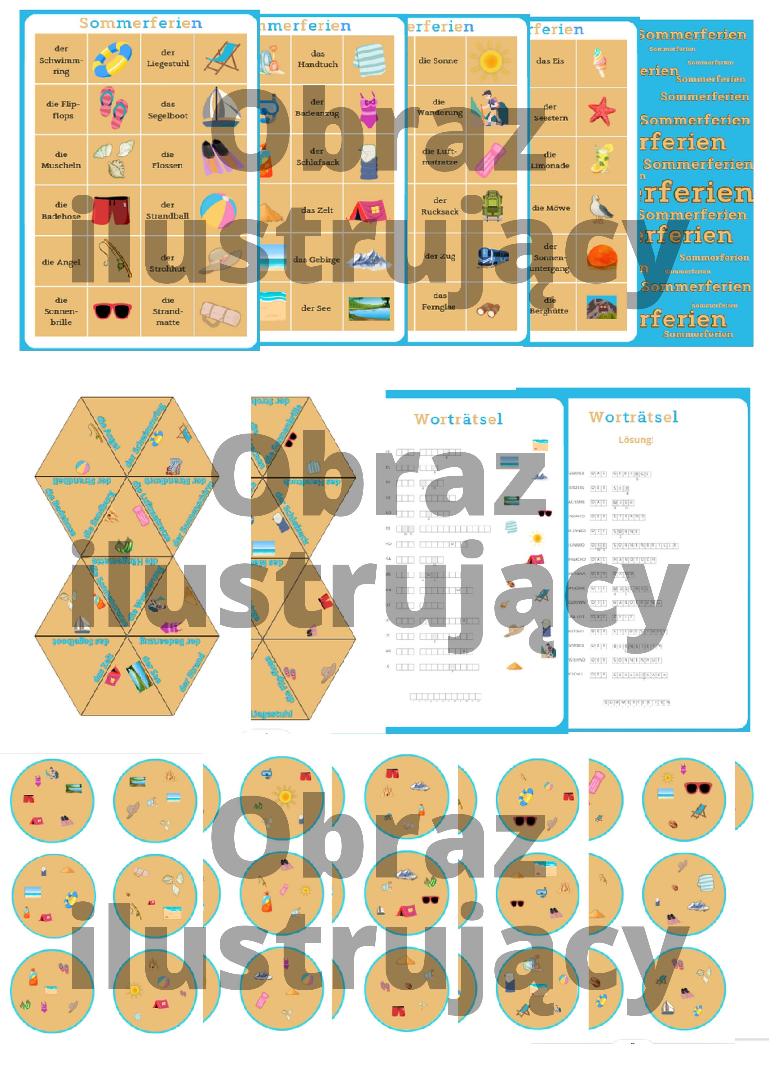 Polecam słówka wakacyjne w różnych odsłonach. gra MEMORY, którą można wykorzystać na różne sposoby, tradycyjnie, kółko i krzyżyk, łapki na muchy, czego brakuje i wiele innych. W sumie jest 48 obrazków i pojęcie po niemiecku do każdego z rodzajnikiem określonym. Oczywiście można wykorzystać mniej, albo wybrać. Poza tym TRIMINO składające się z 24 elementów, gdzie łączymy ze sobą obrazek z pojęciem, ciekawsza wersja domino, w której układamy sześciokąt foremny. Ponadto KARTA PRACY wraz z rozwiązaniem , na której z poprzestawianych wyrazów należy ułożyć słowa i połączyć je z odpowiednim obrazkiem rozwiązaniem. Ostatnią częścią zestawu jest DOBBLE, składające się z 31 kółek, a na każdym z nich umieszczonych jest 6 obrazków. Wszystkie ćwiczone pojęcia są użyte w memory, a obrazki są spójne i w kolorystyce piasku i morza. Dodatkowo są przygotowane plecki, które można wykorzystać w trimino, dobble czy memory.