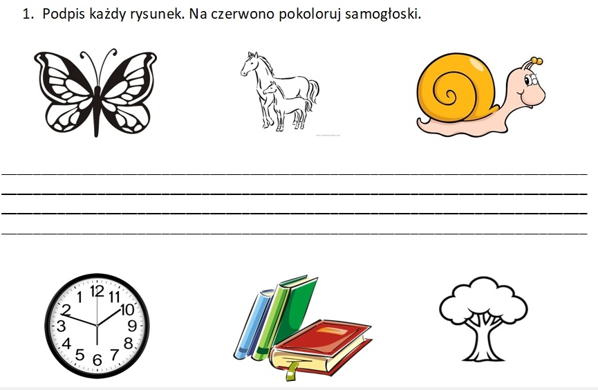 - podpisywanie ilustracji przedstawionych w zadaniu i ze znaczenie samogłosek