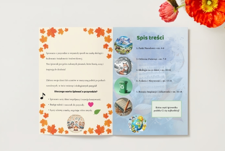 Odkryj wyjątkowy „Śpiewnik Przyrodniczy” – materiał edukacyjny, który łączy naukę o przyrodzie z radością śpiewania i zabawy! Stworzony z myślą o nauczycielach przedszkoli i szkół podstawowych, wspiera rozwój dzieci w sposób kreatywny i angażujący.