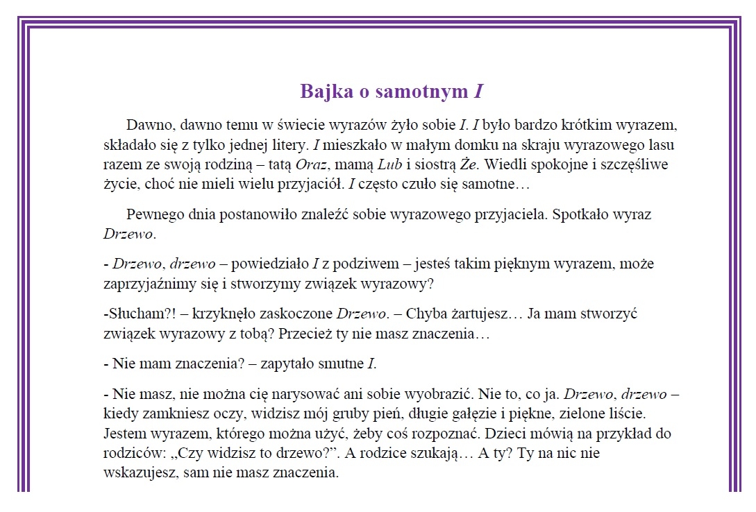 Zachęcam do zakupu wyjątkowej Bajki o samotnym I. Opowiadanie w zabawny sposób tłumaczy, czym są spójniki i jaką pełnią funkcję. Pod tekstem uczniowie znajdą zadania wymagające wyszukiwania informacji w tekście. Przećwiczą też rozpoznawanie i używanie spójników. Do zadań dołączone są odpowiedzi, zatem materiał może być spokojnie wykorzystany w domu. Najlepiej sprawdzi się podczas wprowadzania zagadnienia, ale przyda się też na zajęciach wyrównawczych. Zapraszam do skorzystania!
