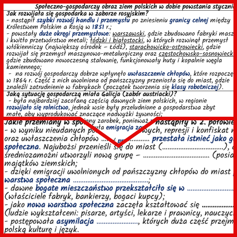 Notatka w formie pytań i odpowiedzi dotycząca sytuacji gospodarczej i przemian społecznych na ziemiach polskich w dobie powstania styczniowego, przygotowana dla klasy 7 według podstawy programowej nauczania historii w szkole podstawowej (Podstawa programowa – Historia – Szkoła podstawowa IV-VIII) oraz karta pracy z wolnymi miejscami do uzupełnienia, ułatwiająca trwałe zapamiętanie wiadomości.