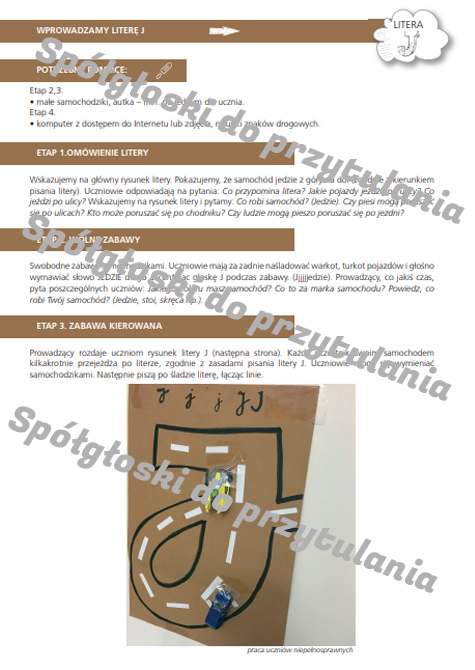 Spółgłoski do przytulania. Nauka liter poprzez zmysły, wrażenia i zabawę. Monografia litery J wraz ze scenariuszem jej wprowadzania, kartami pracy.O publikacji: Książka „Spółgłoski do przytulania” składa się z 17 liter. Zawarte są w niej spółgłoski z wyłączeniem tych z polskimi znakami diakrytycznymi. W książce znajdują się karty pracy oraz szczegółowe scenariusze wszystkich liter przeznaczone dla prowadzącego. Litery poukładane są w specyficzny sposób, częściowo nawiązują do organizacji roku kalendarzowego i szkolnego. Z literą P powąchamy świat, z Z wybierzemy się na wycieczkę do Krakowa, K wraz z bocianem zaprowadzi wiosnę, a z L ubierzemy choinkę. Wprowadzając poszczególne litery 2-3 razy w miesiącu w odstępach 1-2 tygodniowych w czerwcu zakończymy podróż z literą T, wybierając się na wakacje. Udanej zatem podróży!