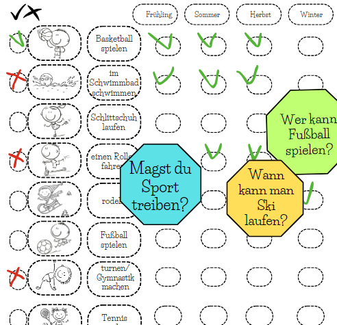 Po zaznaczeniu swoich sportowych umiejętności, uczniowie w parach lub w grupie zadają sobie pytania: Wer kann schwimmen? Kannst du Rad fahren? Wann kann man rodeln? Pilnujemy uczniów, żeby odpowiadali pełnymi zdaniami. Pytania zawarte w zestawie do wydrukowania.