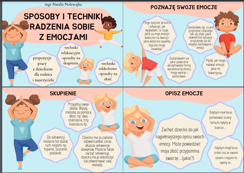 Idealne jako gazetka dla rodziców, dzieci, ebook lub jako pomoc podczas zajęć przy uczeniu dzieci różnych technik radzenia sobie z emocjami dla dzieci i młodzieży.