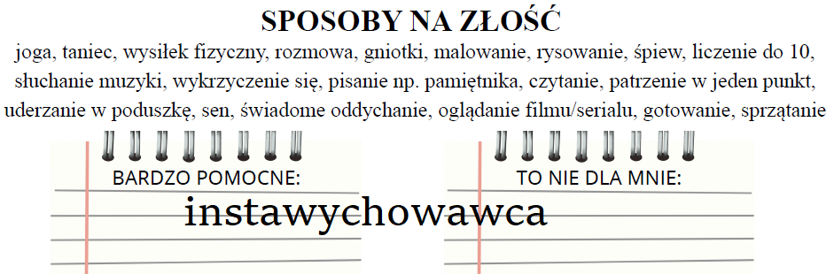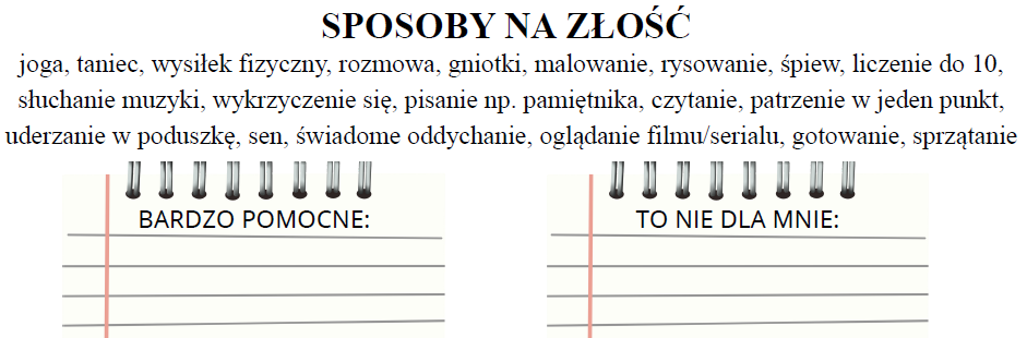Karta pracy zawiera różne propozycje na to jak można radzić sobie ze złością. Uczniowie wybierają metody, które preferują.