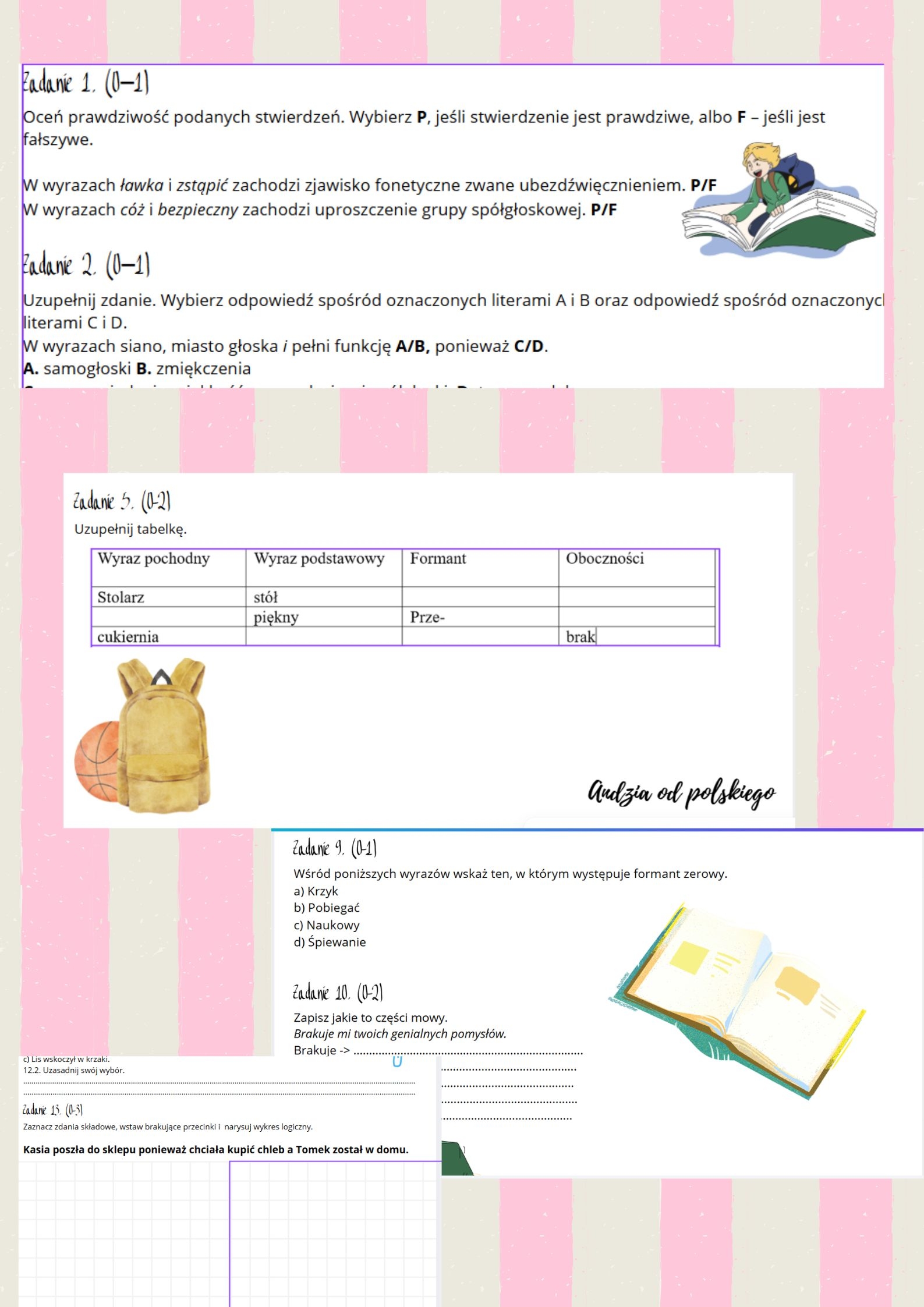 Zadania egzaminacyjne z fonetyki, słowotwórstwa, części zdania i części mowy. Plik można wykorzystać jako sprawdzian lub kartę pracy.