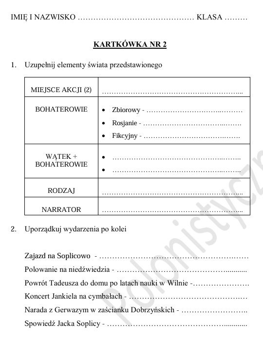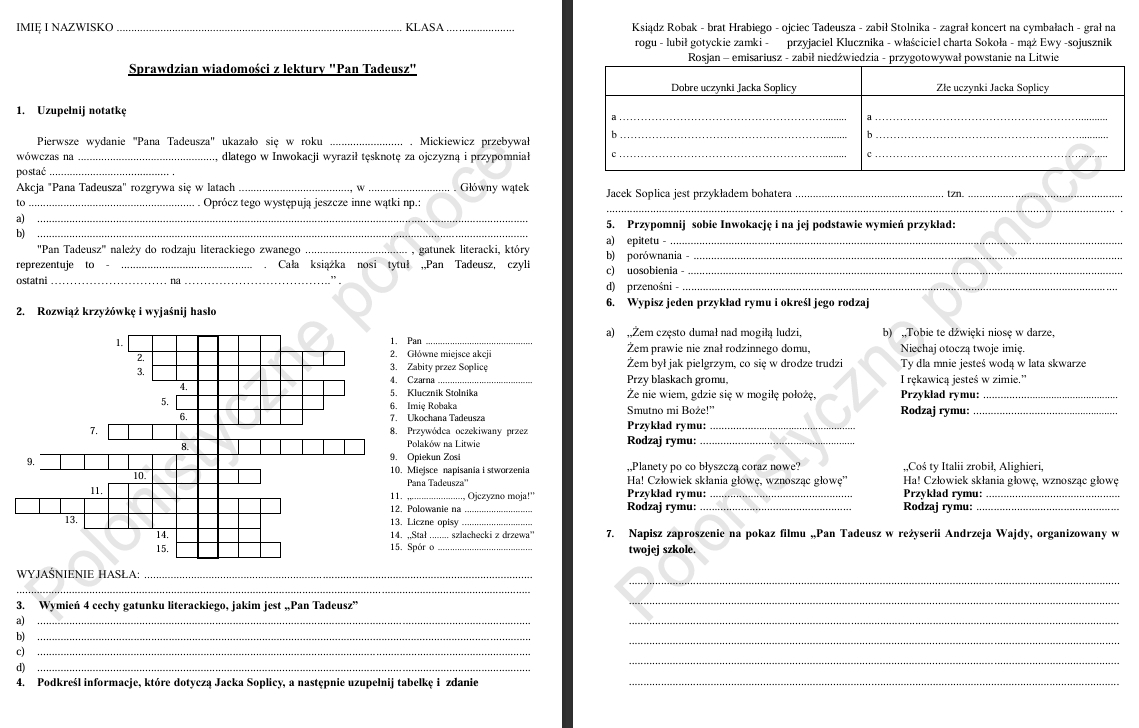 Materiały składają się z dwóch części: sprawdzianu po omówieniu lektury "Pan Tadeusz" oraz pięciu kartkówek obejmujących tematy, jakie omawiane były na lekcji. Kartkówki można wykorzystać pojedynczo lub w całości mogą się złożyć na sprawdzian. Kartkówka nr 1: postać Adama Mickiewicza, kartkówka nr 2: świat przedstawiony i bohaterowie, kartkówka nr 3: postać Jacka Soplicy, kartkówka nr 4: cechy epopei i zwyczaje szlachecki, kartkówka nr 5: inwokacja i środki poetyckie. Sprawdzian po omówieniu lektury stanowi osobną część i zawiera m. in. takie zagadnienia jak: zaproszenie, krzyżówkę, znajomość lektury, bohaterowie