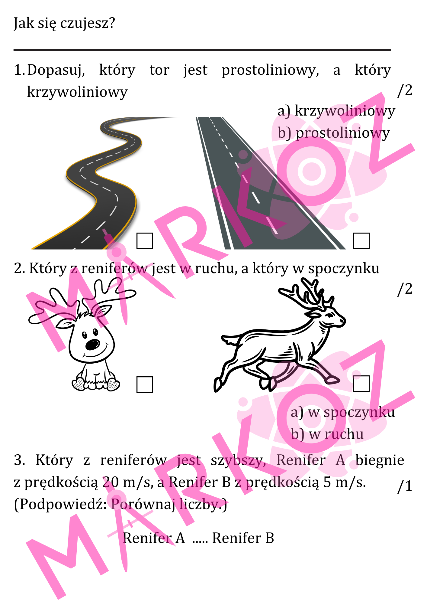 Rysunki sanek, choinek, wykresów i torów ruchu nadają testowi wyjątkowy klimat i pomagają w zrozumieniu treści