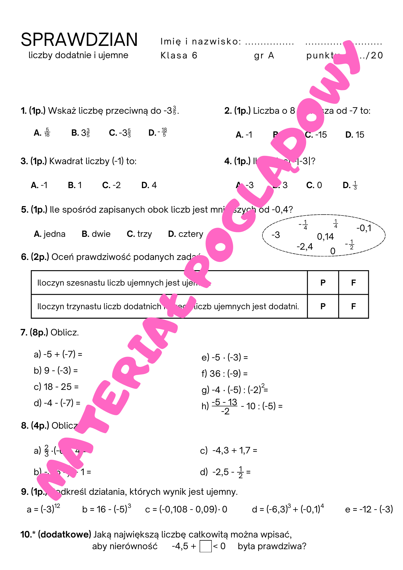 Materiał zawiera sprawdzian/ kartę pracy z działu "Liczby dodatnie i liczby ujemne realizowanego najczęściej w klasie 6 (zwiera ułamki). Obejmuje tematykę: