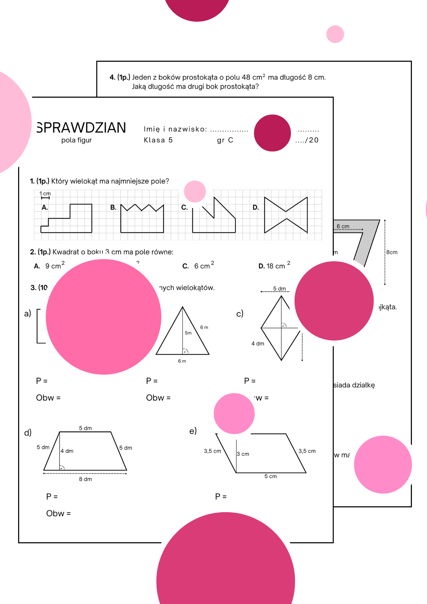 Materiał zawiera sprawdzian/ kartę pracy z działu "Pola figur" w klasie 5. Obejmuje tematykę: