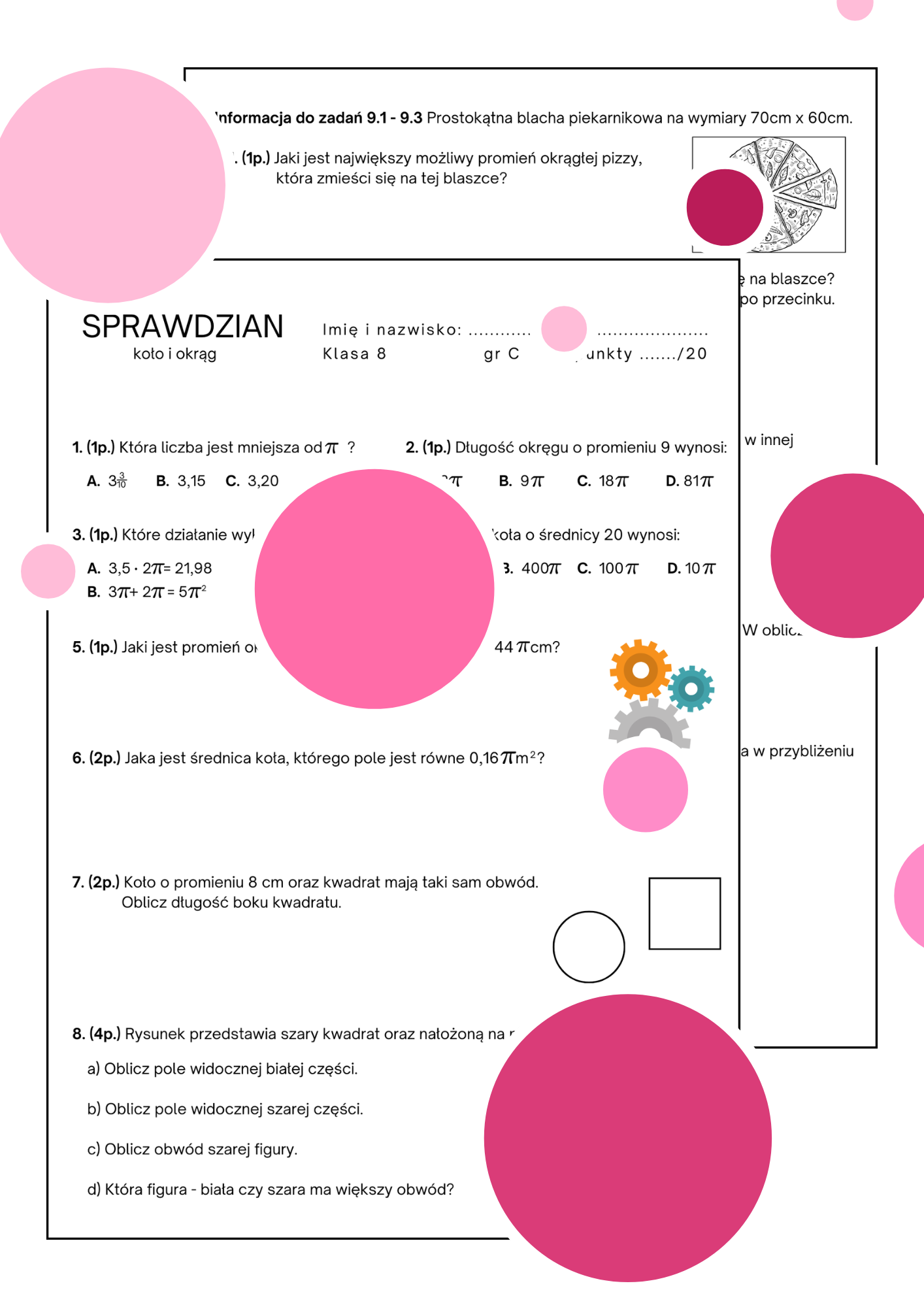 Materiał zawiera sprawdzian/ kartę pracy z działu "Koło i okrąg" w klasie 8. Obejmuje tematykę: