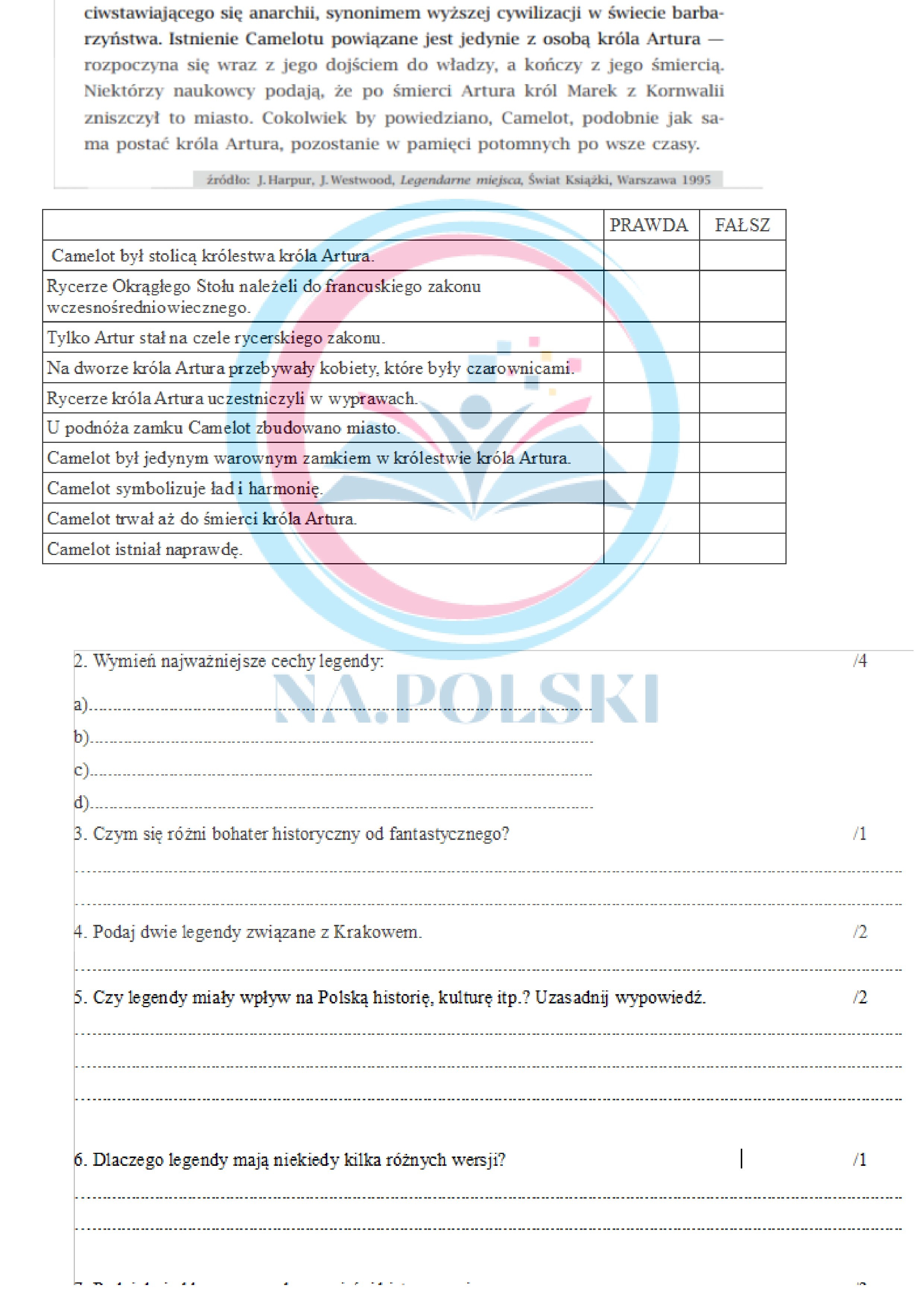 Czytanie ze zrozumieniem, pytania sprawdzające wiedzę ogólną z legend, którą powinien dysponować uczeń klasy 6.