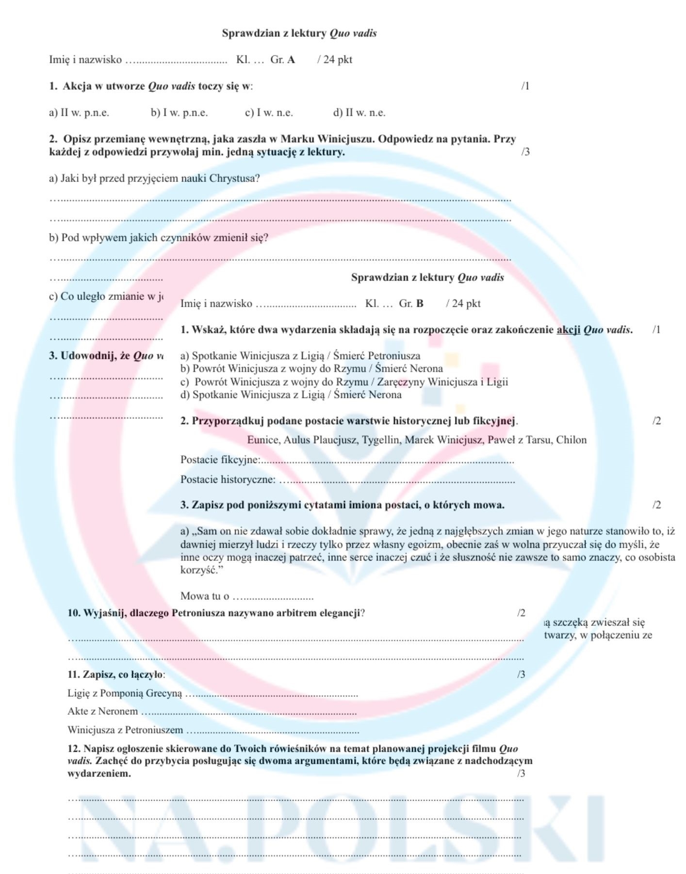Sprawdzian z lektury "Quo vadis" - grupa A i B