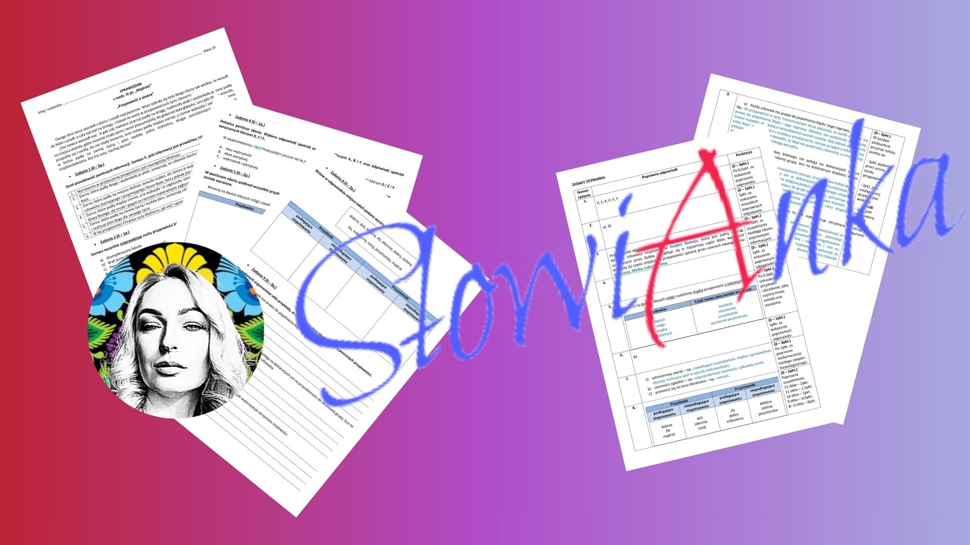 Sprawdzian składa się z 9 zadań, które opierają się na przypowieści o siewcy . Zagadnienia, wokół których koncentruje się sprawdzian: - czytanie ze zrozumieniem; - literatura - Biblia (Stary Testament: stworzenie świata, Nowy Testament - przypowieści: o miłosiernym Samarytaninie, o talentach, o synu marnotrawnym); - gatunek literacki jakim jest przypowieść (wyznaczniki gatunku); - biblizmy - związki frazeologiczne pochodzące z Biblii; - gramatyka: rodzaje przydawek, przymiotniki i przysłówki niepodlegające stopniowaniu, nieodmienne części mowy: partykuła i wykrzyknik); - forma wypowiedzi pisemnej: wypowiedź argumentacyjna (argumenty logiczne, rzeczowe i odwołujące się do emocji). Zachęcam do zakupu.