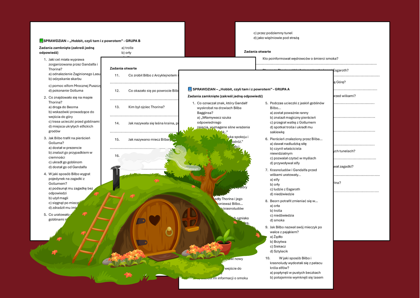 Przedstawiamy kompletny, starannie opracowany sprawdzian z treści lektury „Hobbit, czyli tam i z powrotem” J.R.R. Tolkiena – idealny dla nauczycieli języka polskiego w klasach 4–6. Materiał przygotowany w dwóch wersjach (Grupa A i Grupa B) pozwala przeprowadzić test nawet w licznych klasach.