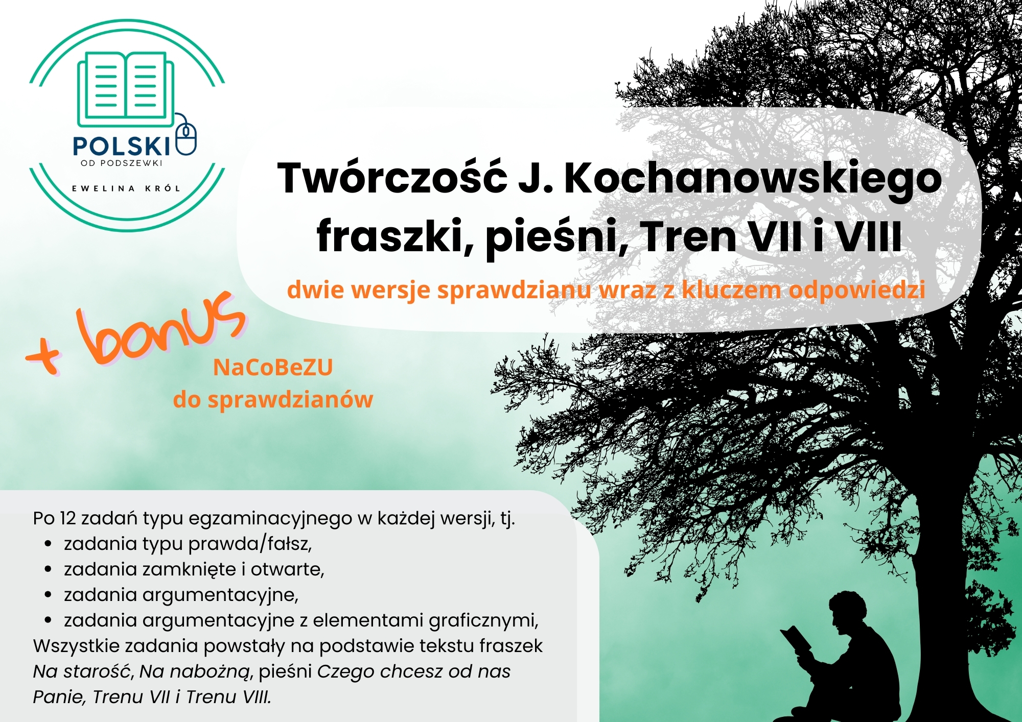 W pakiecie znajdują się dwa gotowe sprawdziany do wykorzystania na lekcjach języka polskiego, przygotowane w oparciu o utwory Jana Kochanowskiego. Materiały sprawdzają umiejętność czytania ze zrozumieniem, analizę tekstu literackiego, znajomość środków stylistycznych, cech gatunków: fraszki, pieśni, trenu oraz interpretację utworów. Doskonałe również przy powtórkach przed egzaminem ósmoklasisty.