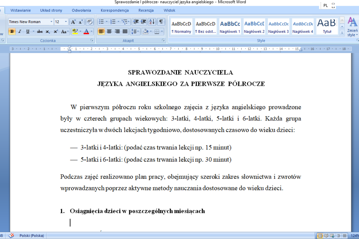 Sprawozdanie nauczyciela języka angielskiego za I półrocze pracy w przedszkolu