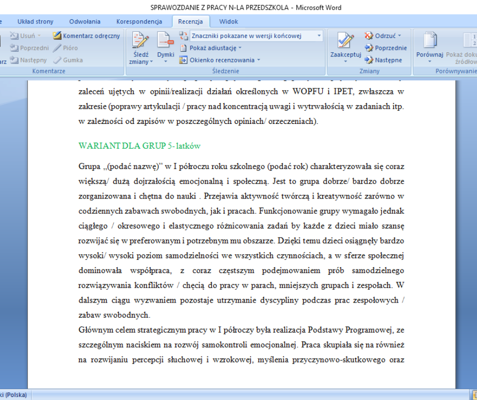 Zawiera: - metryczkę - charakterystykę grupy i organizację pracy (szablon zawiera pięć gotowych wariantów opisów charakterystyki pracy grupy w I półroczu. Wychowawca wybiera wariant dla nauczanej grupy wiekowej) - realizację działań dydaktyczno-wychowawczych (metody pracy, programy i projekty, uroczystości i występy, wyjścia i wycieczki, udział w życiu przedszkola, akcje charytatywne) - analizę postępów dzieci (opis rozwoju w 4 obszarach: poznawczym, fizycznym, emocjonalnym i społecznym) - współpracę środowiskową i instytucjonalną oraz rozwój nauczyciela (współpraca z rodzicami, instytucjami, rozwój wychowawcy) - wnioski i rekomendacje do dalszej pracy (wnioski i rekomendacje, a po nich modyfikacje działań do realizacji w II półroczu) Sprawozdanie ma format dokumentu do edycji, w którym nauczyciel wybiera materiał przeznaczony dla jego grupy wiekowej, a następnie na podstawie przygotowanych wzorcowych opisów edytuje je wybierając spośród zamieszczonych w nim propozycji, by sprawozdanie odzwierciedlało funkcjonowanie danej grupy.