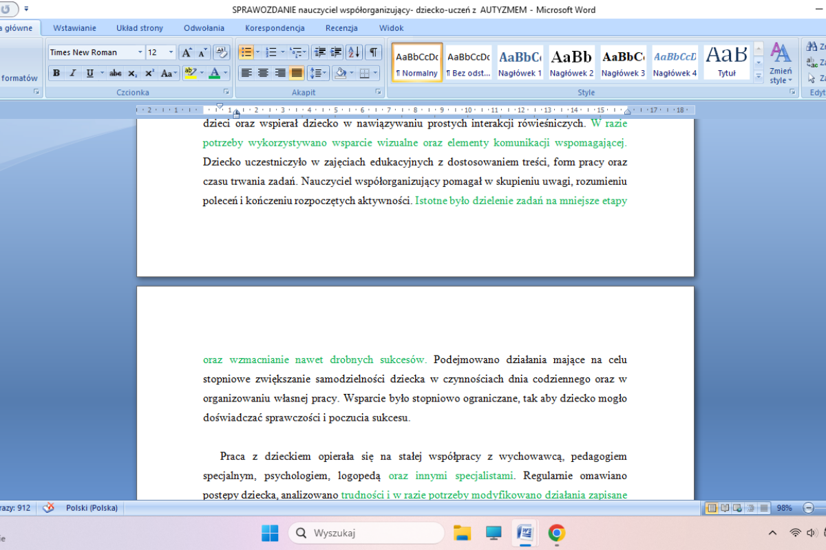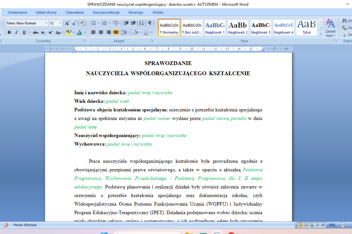 Sprawozdanie nauczyciela WSPÓŁORGANIZUJĄCEGO- dziecko z AUTYZMEM