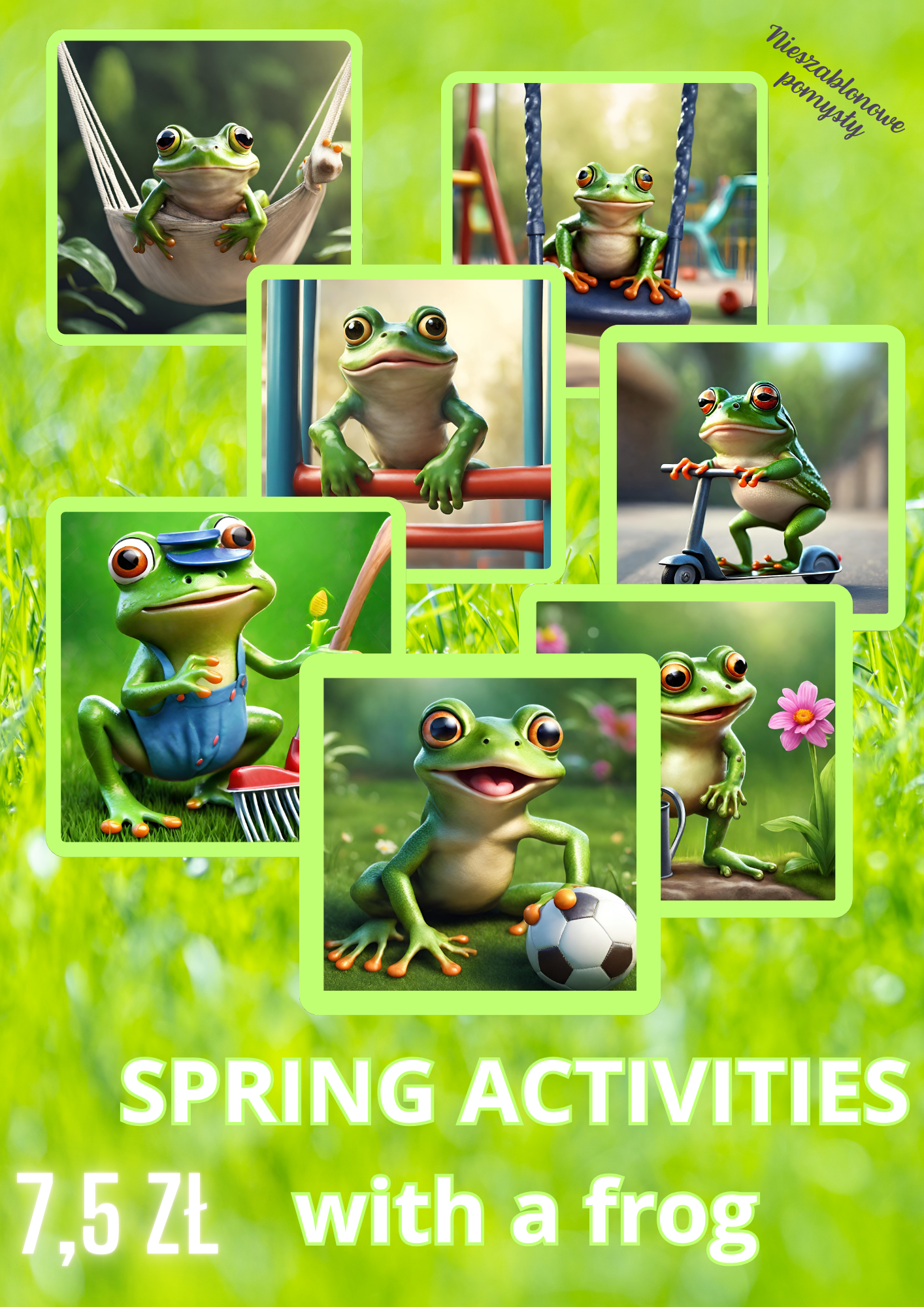 SPRING ACTIVITIES WITH A FROG : zestaw składający się z 16 kart obrazkowych, 30 kart memo, 16 zdań opisujących obrazki, czasowniki w bezokoliczniku oraz 12 plansz bingo. Dzięki tym materiałom wprowadzimy i utrwalimy typowe wiosenne czynności np: ride a bicycle, ride a scooter, play on the hopscotch, swing, water the flowers.....