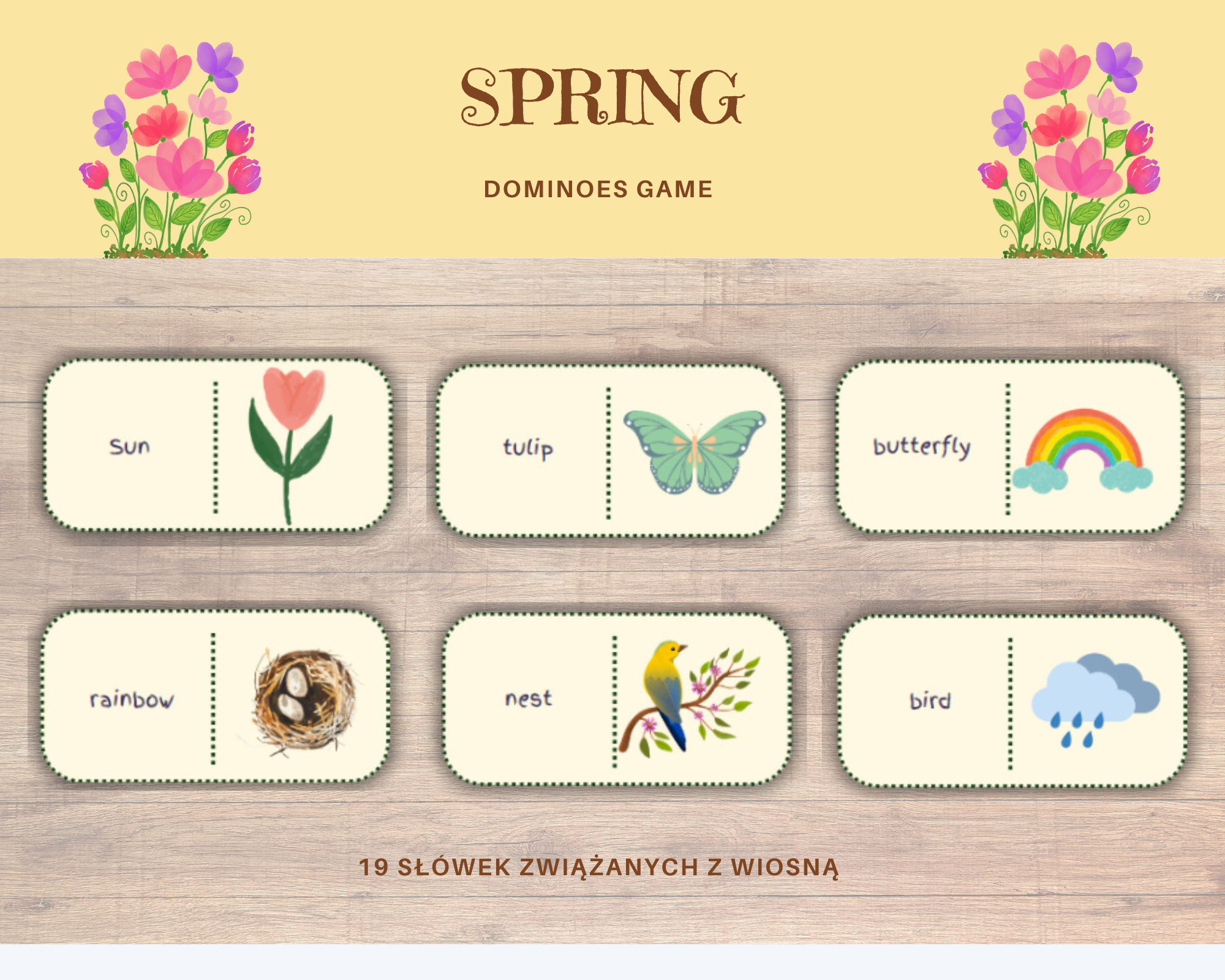 Spring domino to doskonała gra edukacyjna, stworzona specjalnie z myślą o lekcjach języka angielskiego poświęconym tematyce wiosennek