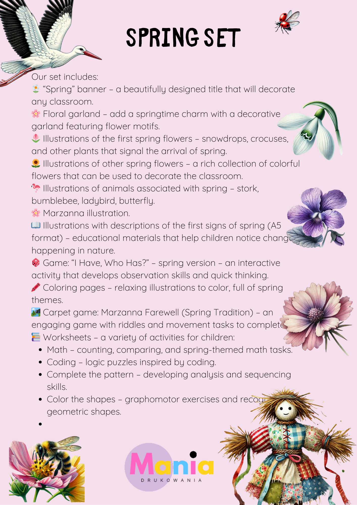 Mania Drukowania – kreatywne materiały edukacyjne do drukuW sklepie Mania Drukowania oferujemy starannie opracowane materiały PDF do samodzielnego wydruku, stworzone z myślą o nauczycielach, terapeutach, rodzicach oraz wszystkich, którzy pracują z dziećmi w wieku przedszkolnym i wczesnoszkolnym.Nasza oferta obejmuje m.in.: karty pracy i zadania rozwijające umiejętności dzieci, gry edukacyjne, zabawy ruchowe i pakiety tematyczne, dekoracje na święta, uroczystości przedszkolne i pory roku, zaproszenia i ozdoby na urodziny oraz inne okazje, kalendarze, girlandy, plakaty oraz dodatki do organizacji zajęć. Dlaczego warto wybrać Mania Drukowania?✔️ Materiały tworzone z dbałością o estetykę i wartość edukacyjną.✔️ Pomoc w organizacji zajęć, świąt i codziennej pracy z dziećmi.✔️ Jasne instrukcje, kolorowe grafiki i przyjazny styl pracy z dziećmi. Naszą misją jest wspieranie edukacji przez kreatywne i atrakcyjne rozwiązania gotowe do użycia – zawsze w duchu nauki przez zabawę.