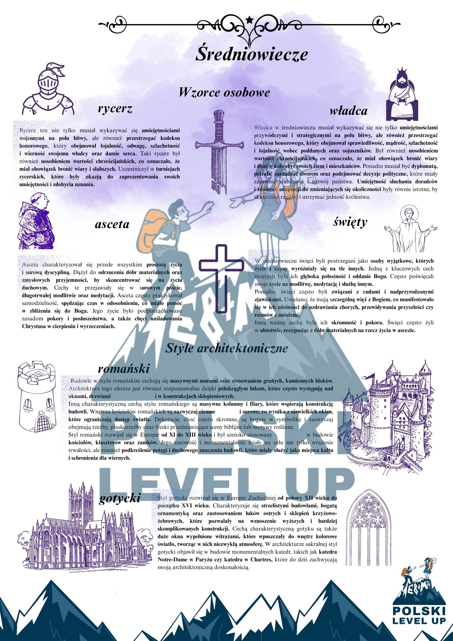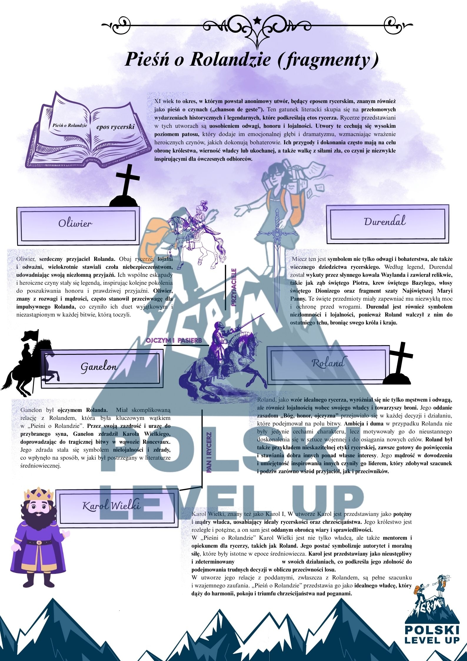 11 stron opracowania epoki: Materiał składa się z opracowanego materiału dotyczącego literatury średniowiecza. Wewnątrz znajdziesz analizę najważniejszych fragmentów z epoki, m.in. Pieśni o Rolandzie, Rozmowy Mistrza Polikarpa ze Śmiercią czy Bogurodzicy. Na kartach, przy danej historii, pojawiają się również ważne terminy literackie. Ostatnia karta zawiera przykładowe tematy wypracowań, do których możesz wykorzystać tę epokę oraz przykładowe teksty literackie, które nawiązują do tego materiału.