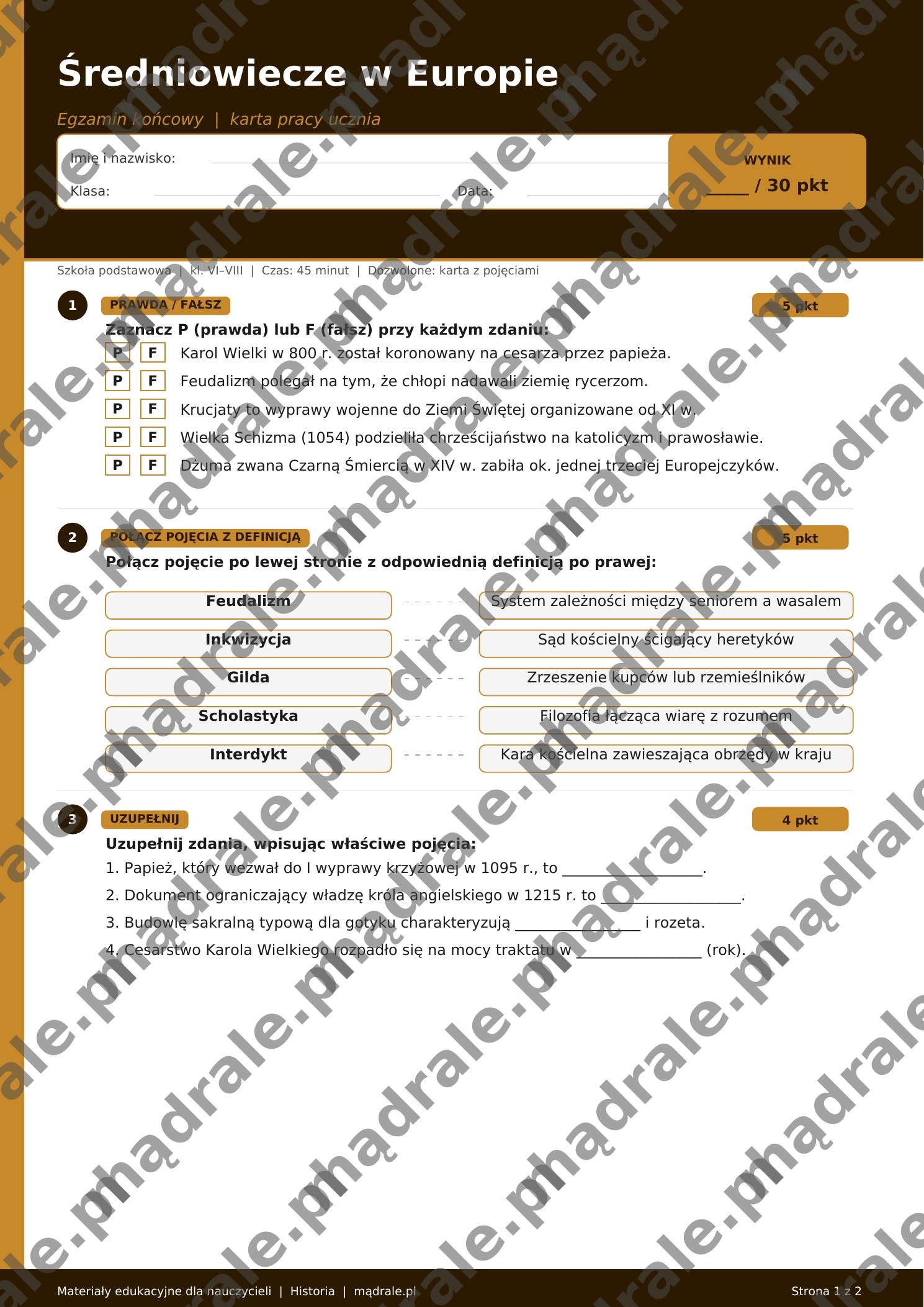 🧩 Kartę pracy / egzamin z zadaniami dotyczącymi średniowiecza w Europie (m.in. system feudalny, rycerstwo, życie codzienne, religia i kultura).