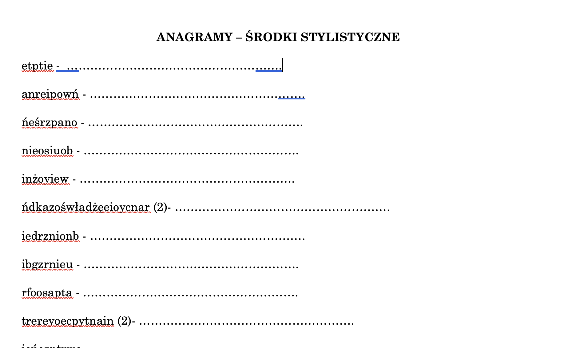 Zabawna i angażująca karta pracy, dzięki której uczniowie utrwalą znajomość figur stylistycznych, rozwiązując anagramy takich pojęć jak epitet, porównanie, metafora czy ożywienie. Świetny materiał na rozgrzewkę lekcyjną, powtórkę przed sprawdzianem lub szybkie ćwiczenie dla uczniów, którzy skończyli pracę wcześniej.