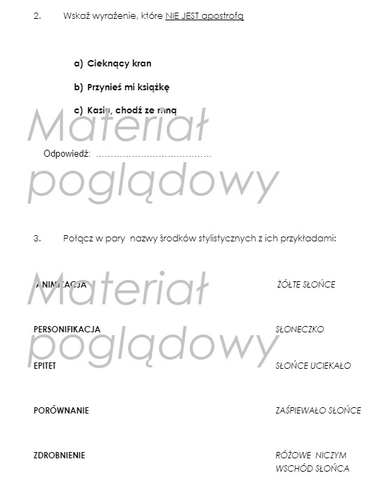 Test pomocny w utrwaleniu materiału: odnajdywanie epitetów, apostrof, dopasowywanie środków stylistycznych do przykładów.