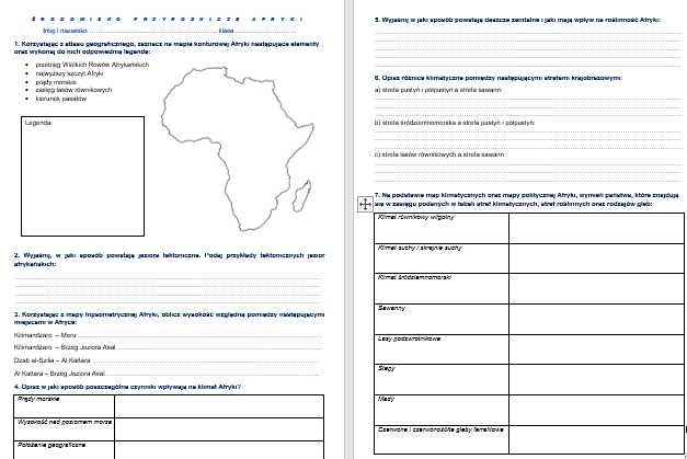 Materiał ćwiczeniowy przeznaczony na lekcję geografii. Przydatny podczas realizowania podstawy programowej z zakresu Afryki w klasie ósmej, ale nie tylko. Kartę pracy można wykorzystać jako pracę z atlasem w szkole ponadpodstawowej. W pracy znajdują się między innymi zagadnienia związane z obliczaniem wysokości względnej, tworzeniem legendy mapy, relacjami pomiędzy komponentami środowiska przyrodniczego.