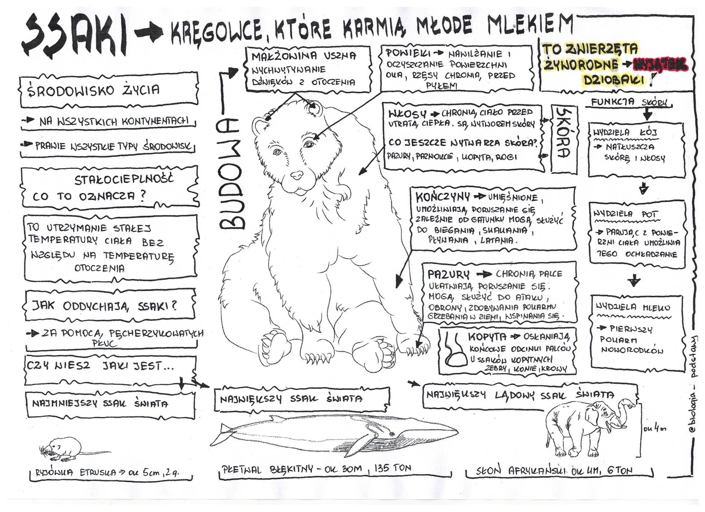Ssaki - Budowa ciała - klasa 6 – sketchnotka jako gotowa notatka z lekcji.