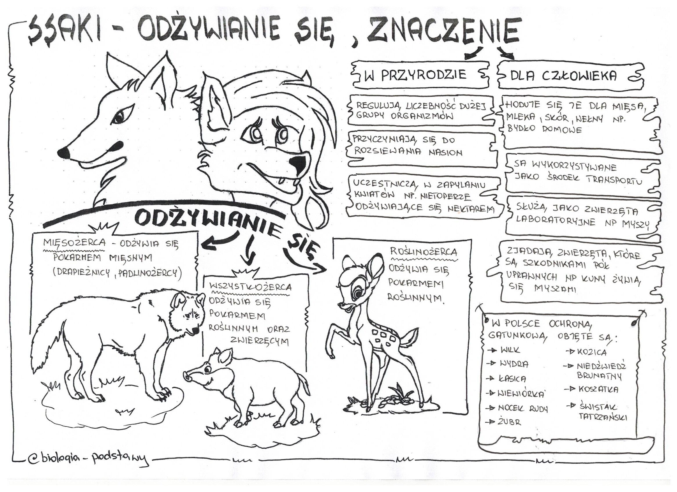 Ssaki cz. 3 – odżywianie się ssaków, budowa zębów, znaczenie ssaków w przyrodzie i dla człowieka– sketchnotka jako gotowa notatka z lekcji.