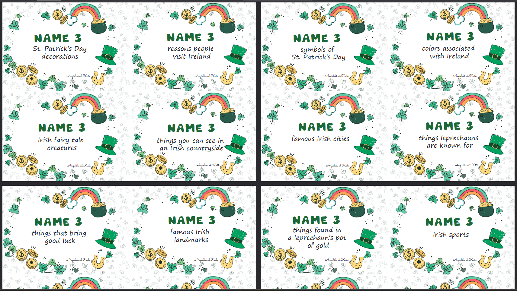 zawiera 40 kart do ćwiczenia mówienia na lekcji języka angielkiego w miły i zabawny sposób o tematyce Dnia św. Patryka i Irlandii. Zagadnienia od A1- B2.