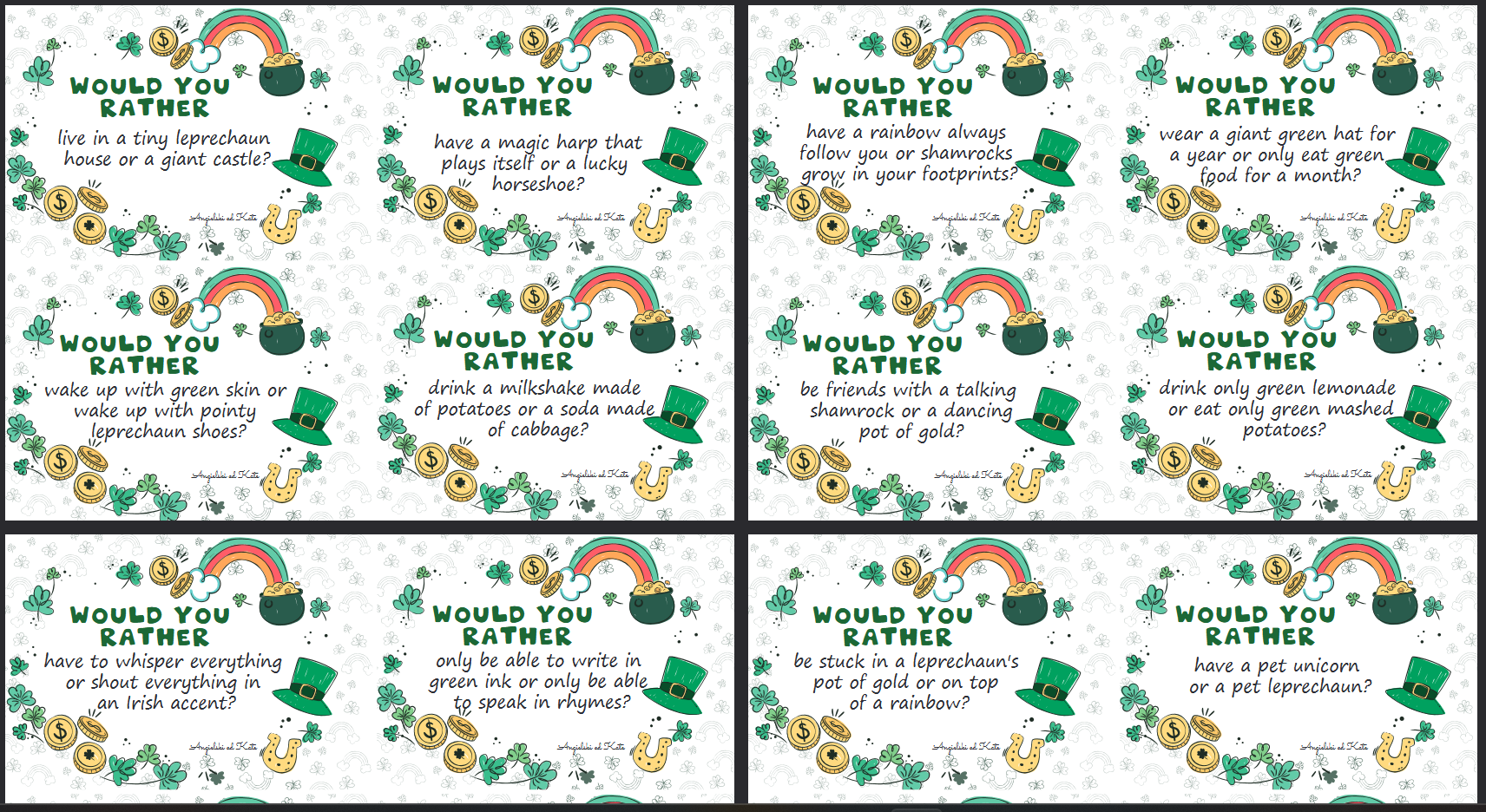 to zestaw 40 zabawnych pytań ćwiczacych mówienie na zajęciach z języka angielskiego związane z Dniem św. Patryka i Irlandią. Poziom A1-B2.
