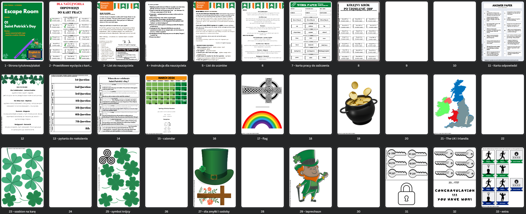 Escape Room dotyczący Dnia Świętego Patryka. Przygotowany tak, by nauczyciel miał mało pracy a uczniowie byli zadowoleni. Pełna instrukcja. Gra jest przygotowana w wersji angielskiej z polskimi tłumaczeniami w instrukcji i liście.