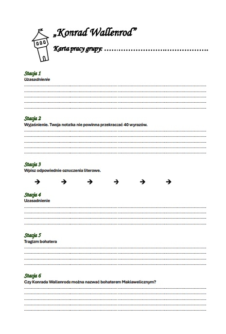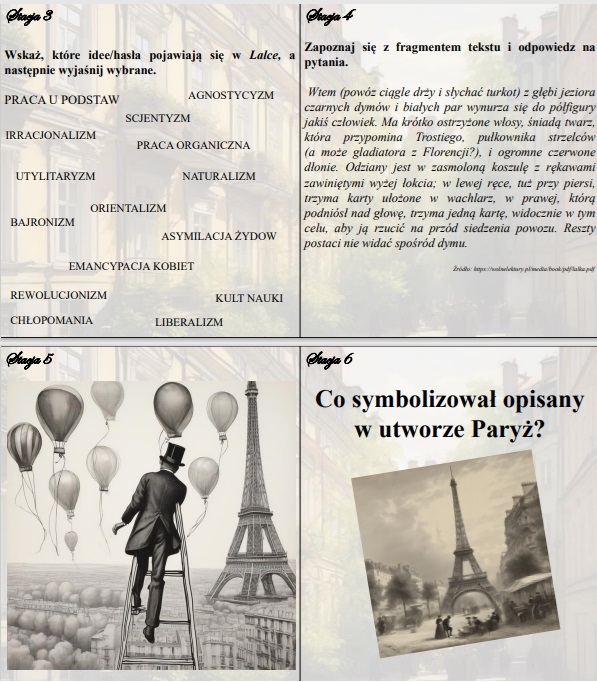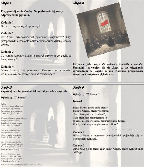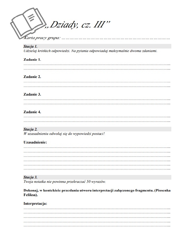 12 stacji - w każdej inne zadanie - wykreślanie, definicje, ikonografia, zadania typu maturalnego i inne. Dają możliwość powtórzenia treści lektury, rozwijają zdolności argumentowania, wnioskowania, pracy z tekstem. Poziom adekwatny do klasy i lektury!