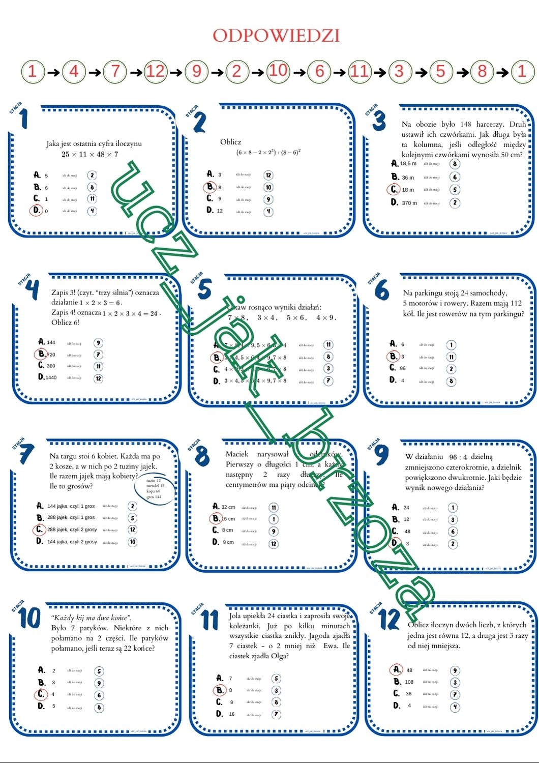 Uwaga! Jedno zadanie wprowadza pojęcie "silnia". Nie ma go w podstawie programowej, ale z doświadczenia wiem, że jest to fajna ciekawostka dla uczniów. Pojęcie jest wyjaśnione, podane są przykłady, więc uczniowie nie będą mieli z tym problemów. Podgląd zadania możesz zobaczyć w galerii.
