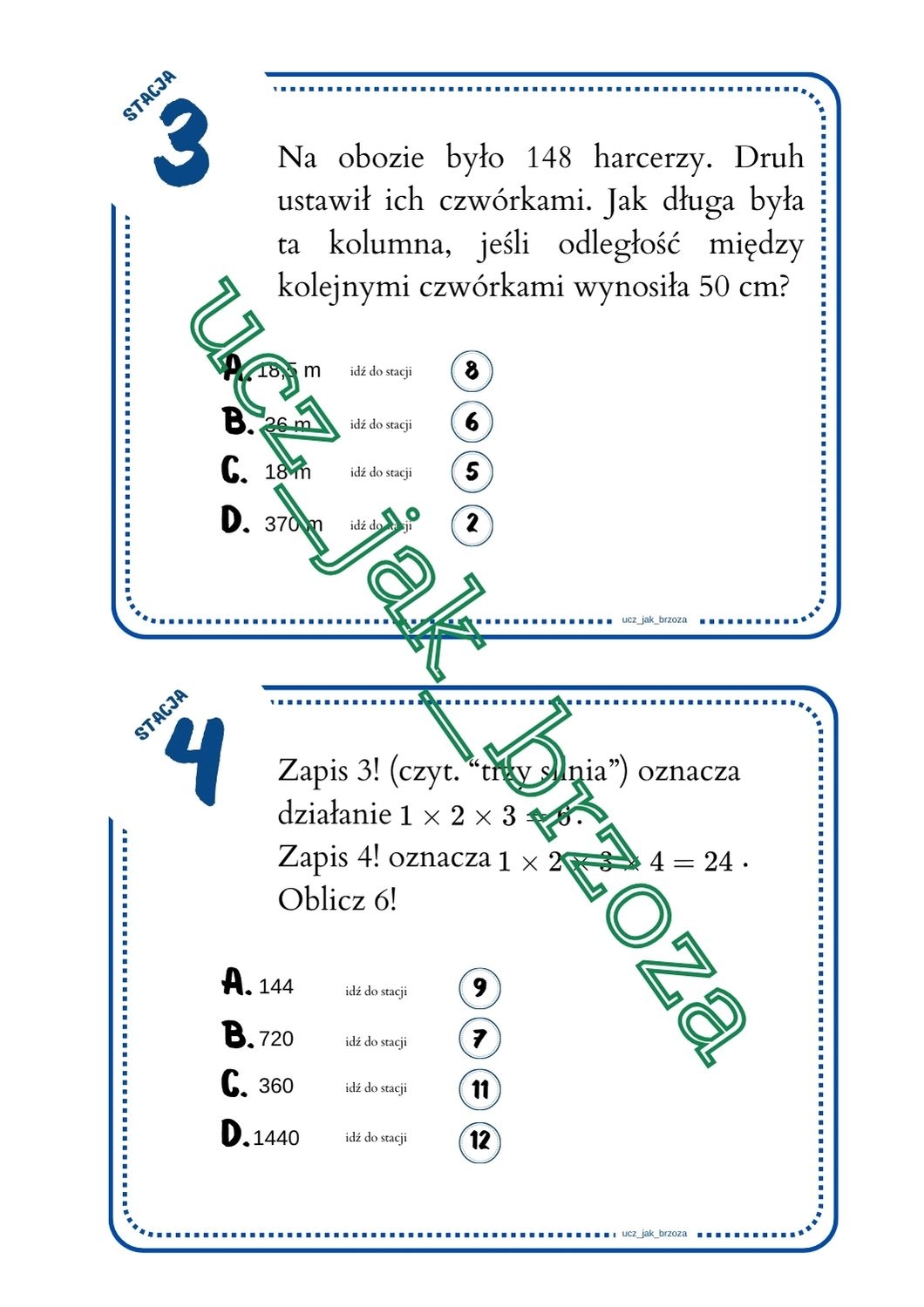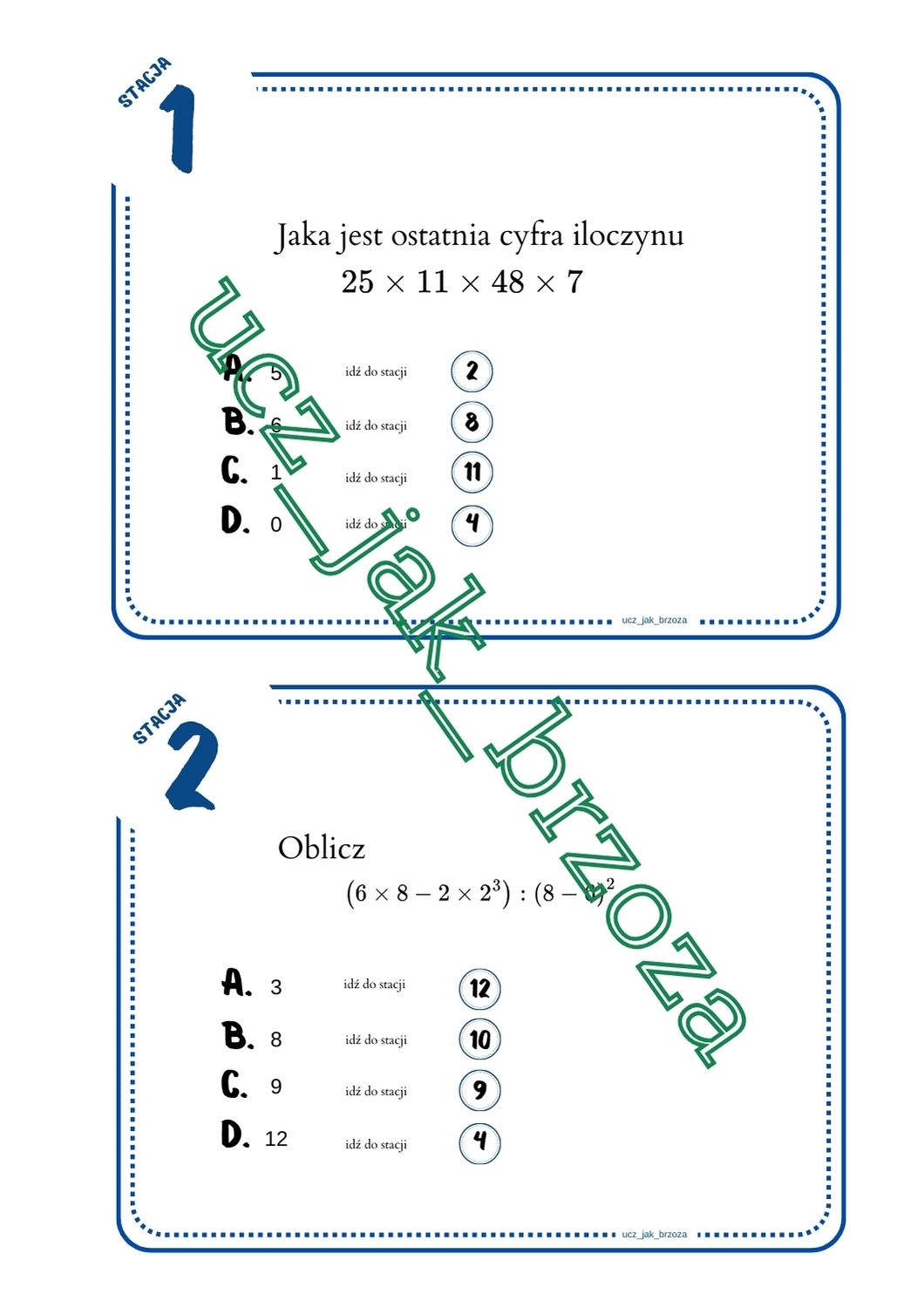 Stacje zadaniowe przygotowane specjalnie na Dzień Tabliczki Mnożenia zawierają zadania głównie z mnożeniem i dzieleniem. Poradzą sobie z nimi uczniowie klas 5 - 8, ale również sprytniejsi z klasy 4 dadzą im radę. Stacje można wykorzystać w szkolnym turnieju międzyklasowym.