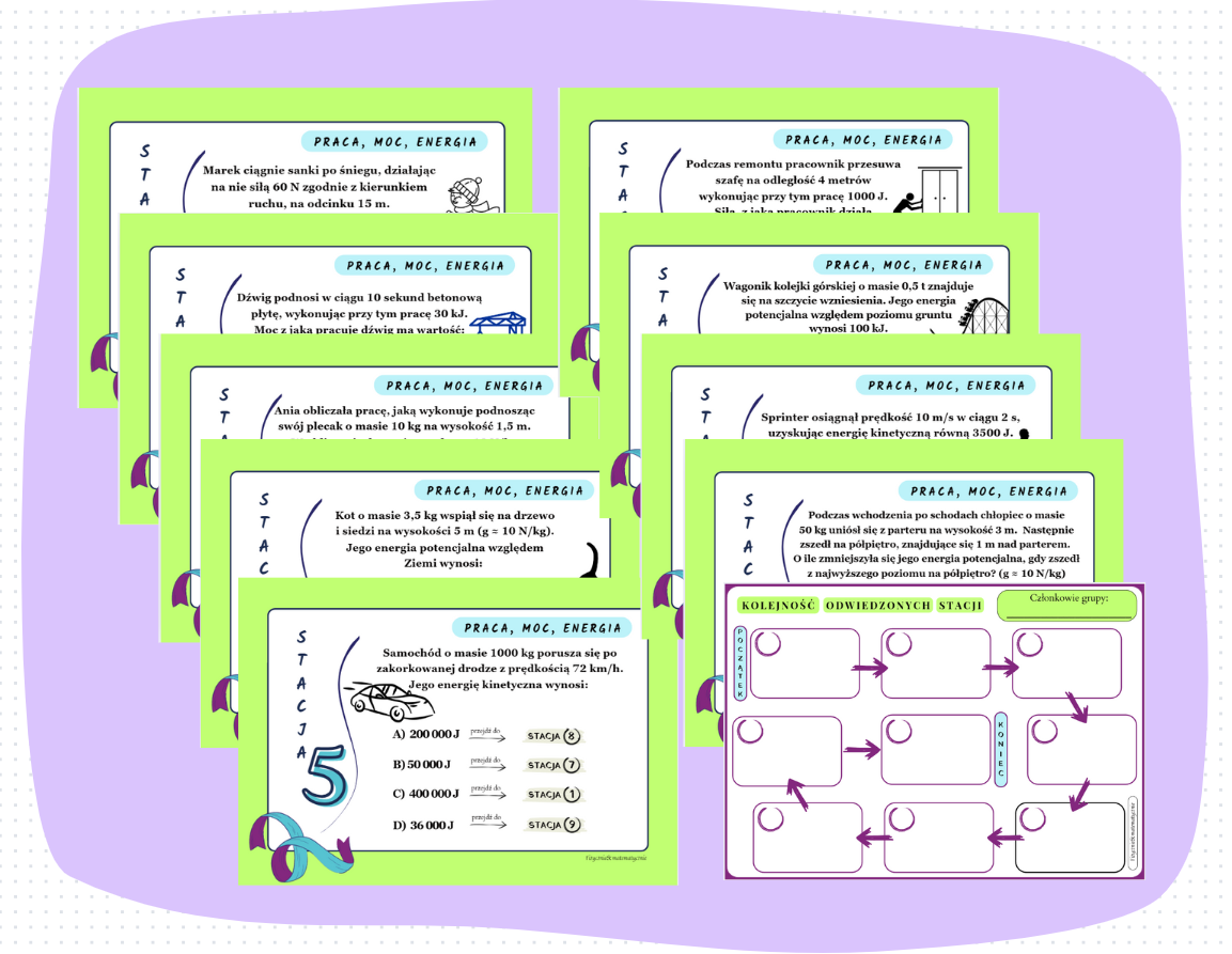 Stacje zadaniowe to lubiana przez uczniów metoda aktywująca i pozwalająca na aktywność ruchowa uczniów podczas lekcji. Materiał ten wykorzystuję podczas lekcji powtórzeniowej. Podczas zajęć pozwalam uczniom na korzystanie z dostępnych materiałów tj. podręcznik, zeszyt, własne notatki. Metoda pracy i materiał nadają się także jako pomysł na lekcję otwartą czy obserwowaną.