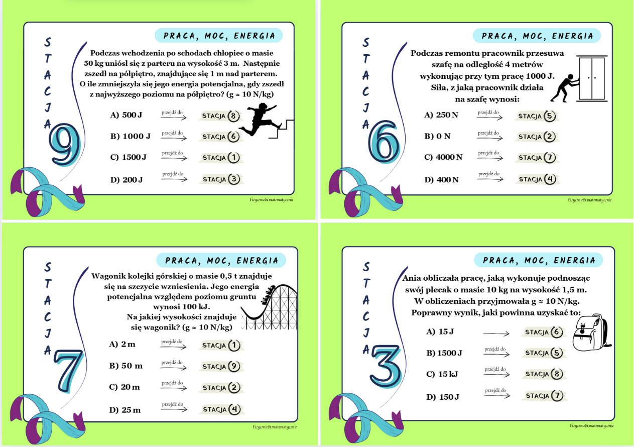 Stacje należy zawiesić w różnych miejscach w klasie. Uczniów dzielimy na grupy – najlepiej, aby każda z nich rozpoczęła rozwiązywanie zadań od innej stacji. Poprawne odpowiedzi przeprowadzą uczniów przez wszystkie stacje. Jeżeli grupa wróci do stacji, na której już była, oznacza to, że błędnie rozwiązała któreś zadanie. W takiej sytuacji można wskazać uczniom stację, na której popełnili błąd, lub pozwolić im samodzielnie go odnaleźć.