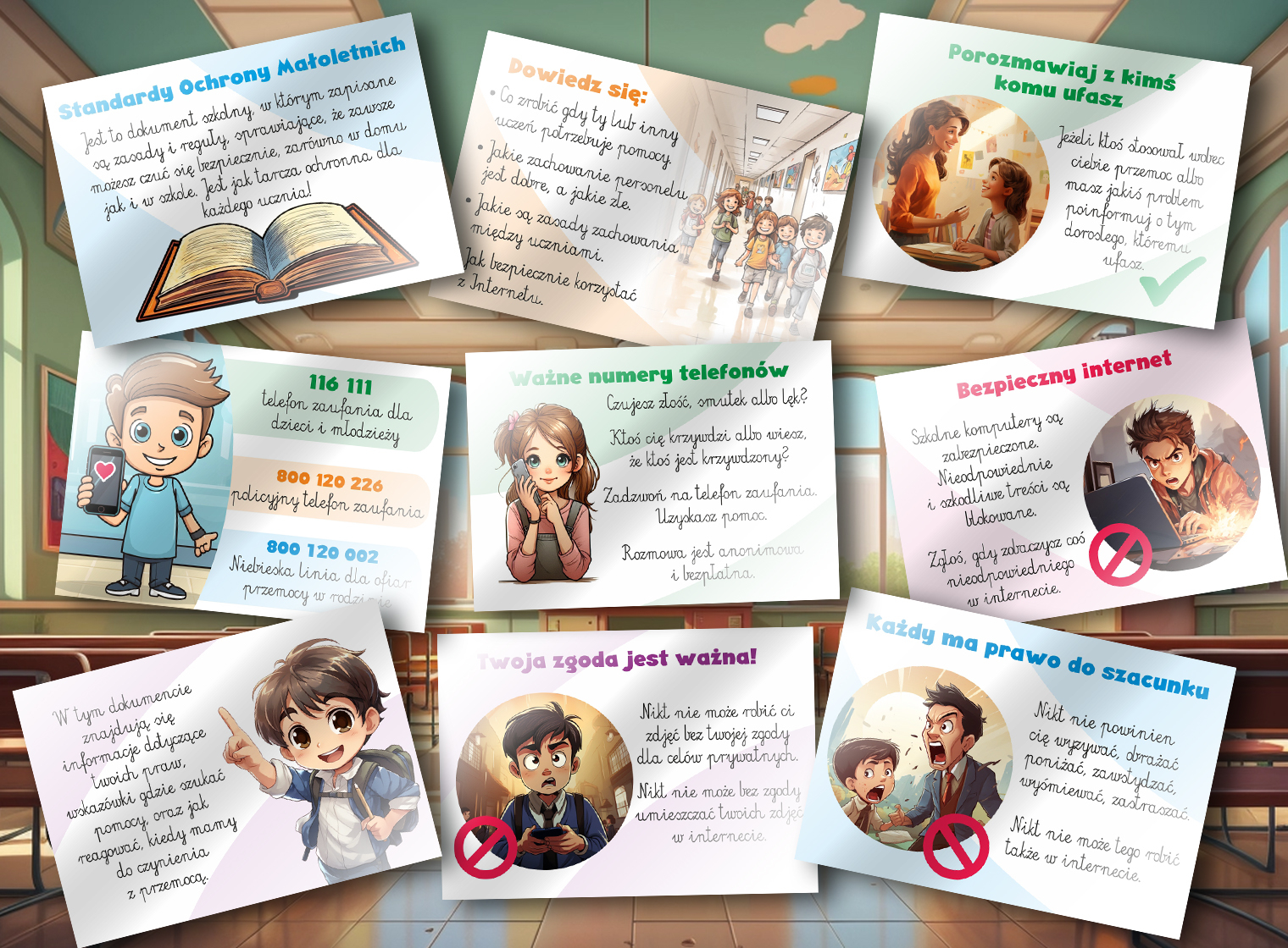 Wersja skrócona Standardów ochrony małoletnich zawiera informacje istotne dla małoletnich dostosowane do możliwości młodszych uczniów. Idealnie nadaje się jako gazetka ścienna.