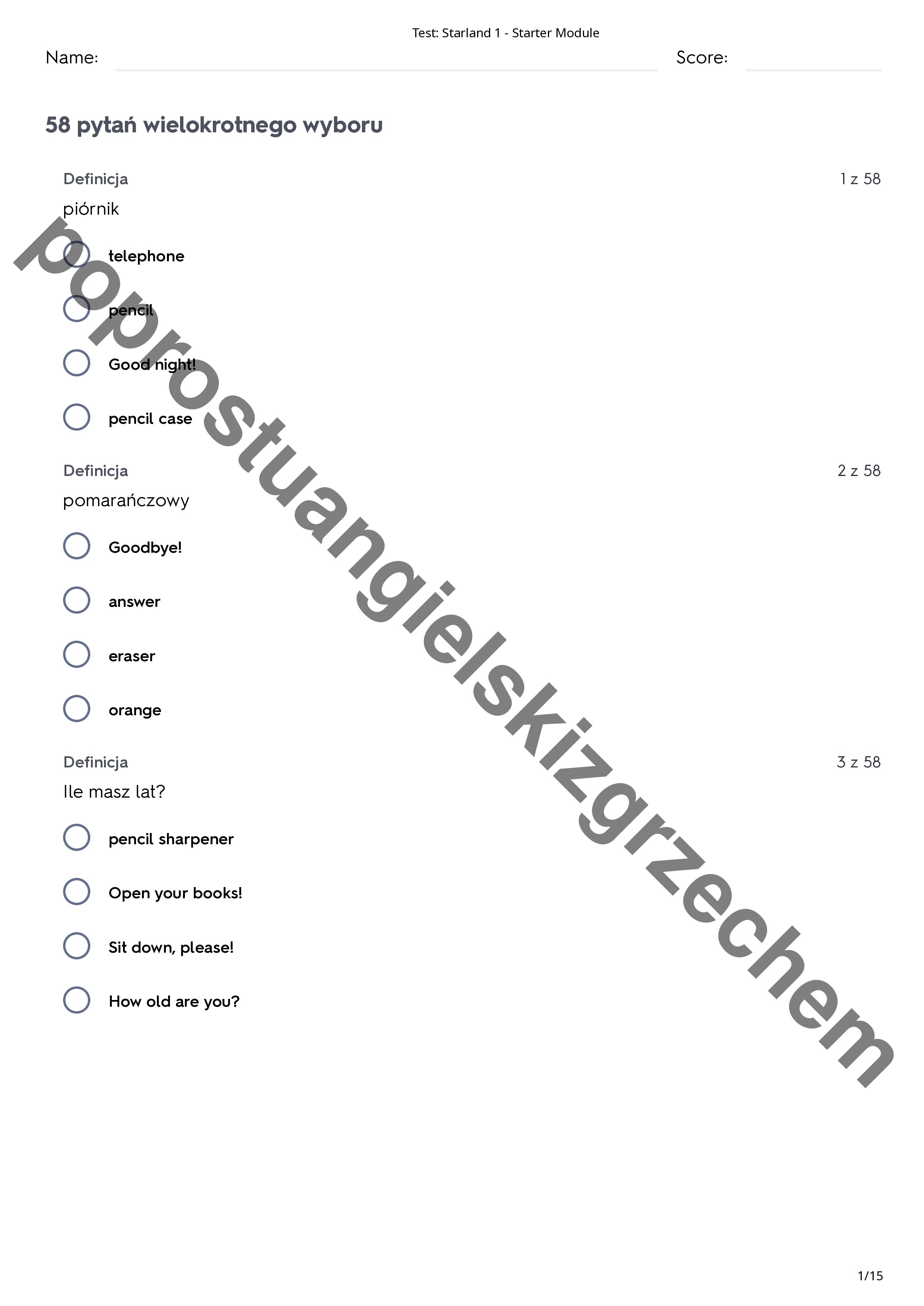 Zestaw zawiera 58 słówek z działu „zerowego” do podręcznika Starland 1. Testy podzielone na 4 kategorie zadań (prawda/fałsz, dopasuj, wielokrotny wybór, pisemny)