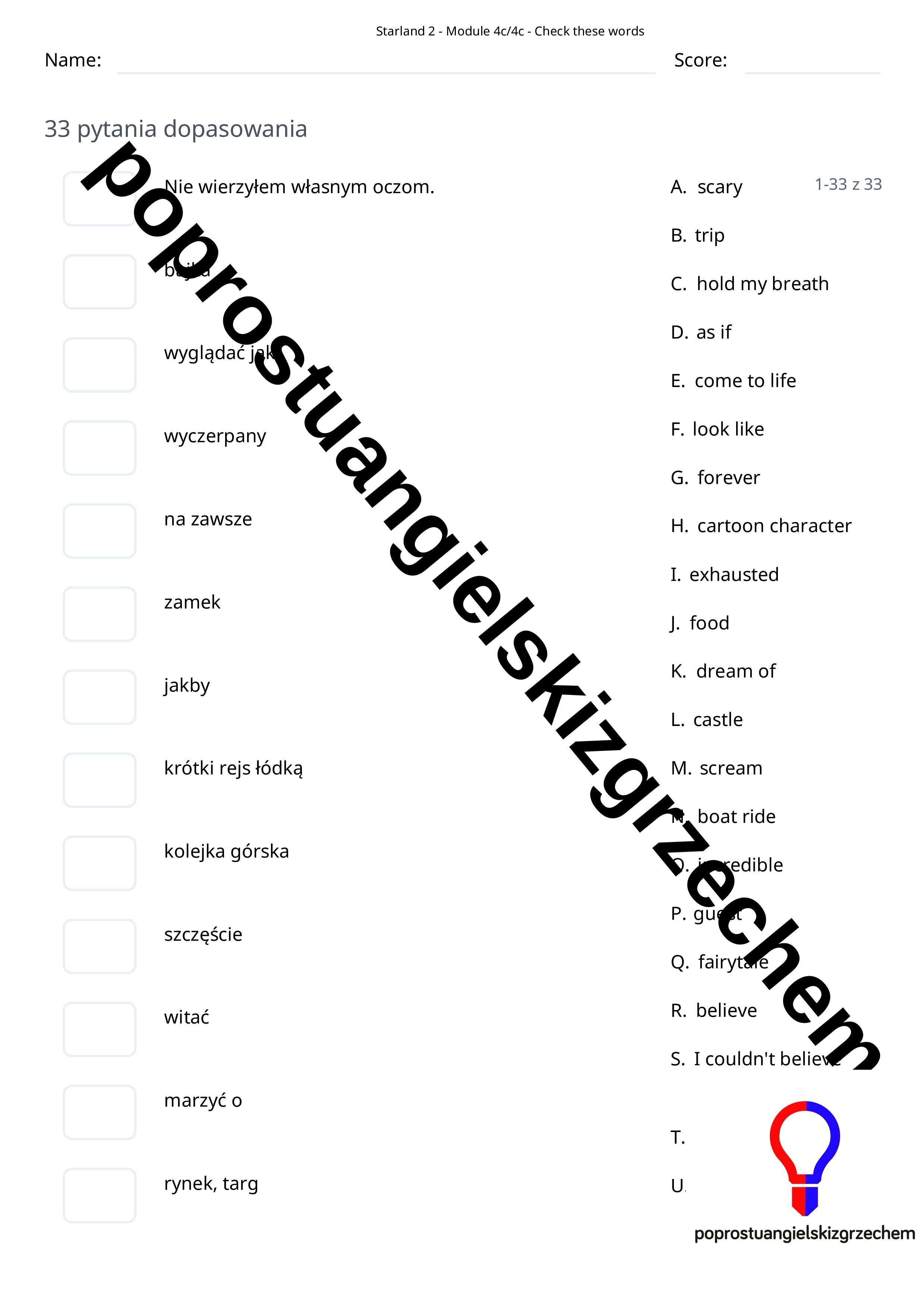 Zestaw zawiera 123 słówka z działu czwartego do podręcznika Starland 2. Testy podzielone są na 5 podrozdziałów, a każdy z nich na 4 kategorie zadań (prawda/fałsz, dopasuj, wielokrotny wybór, pisemny)