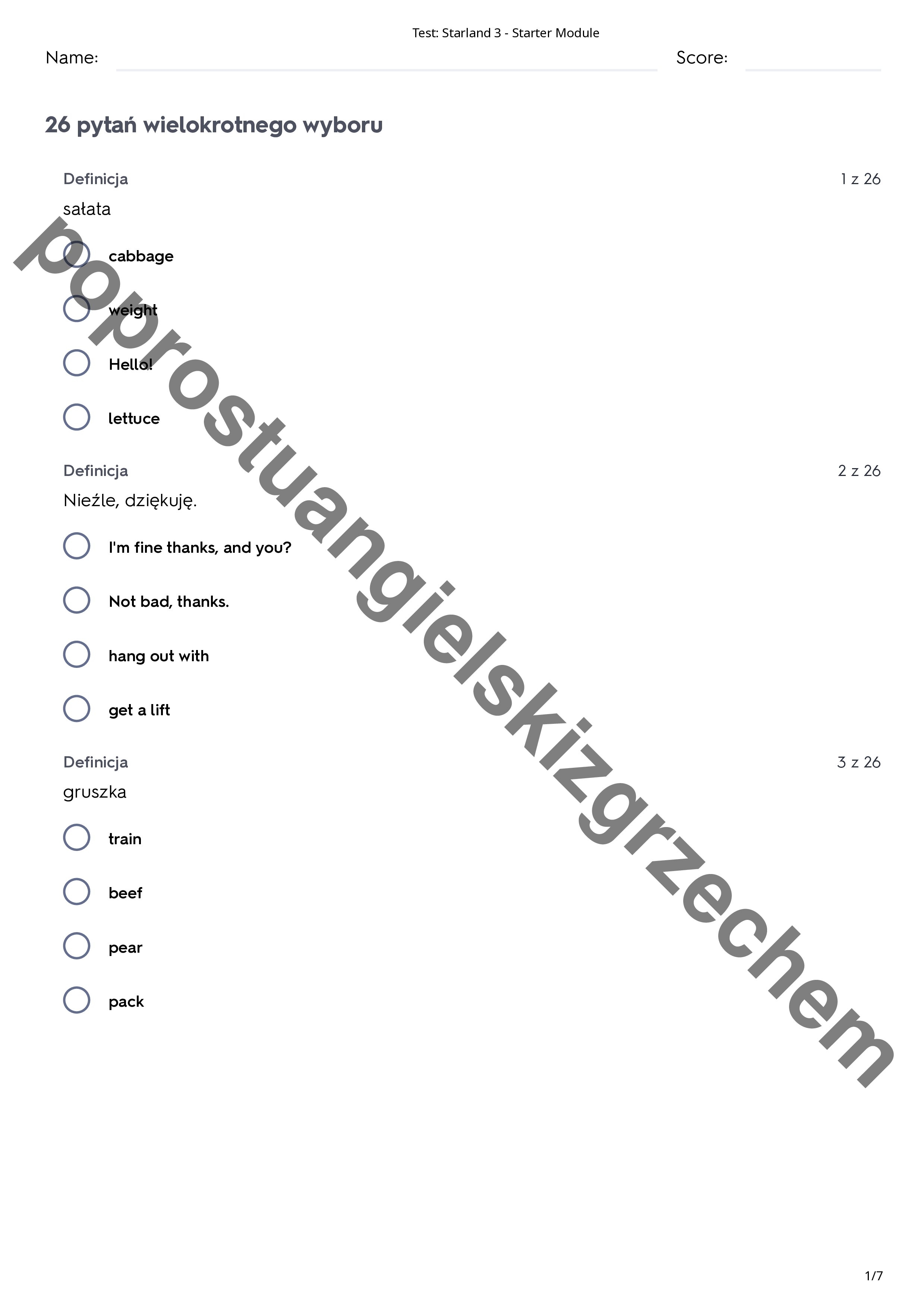 Zestaw zawiera 26 słówek z działu „zerowego” do podręcznika Starland 3. Testy podzielone na 4 kategorie zadań (prawda/fałsz, dopasuj, wielokrotny wybór, pisemny)