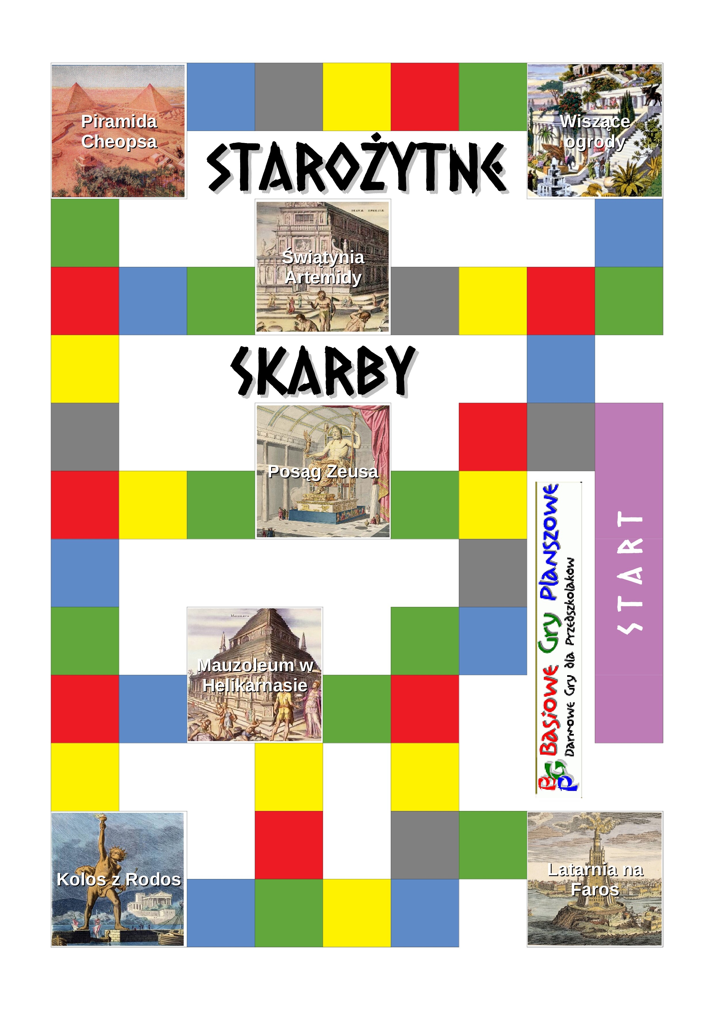 Starożytne Skarby to gra o zbieraniu skarbów schowanych wśród 7 cudów starożytnego świata. Gra będzie wymagać od graczy szacowania szans dotarcia jako pierwszy do siedmiu zabytków na planszy. Niestety w rzeczywistości większość z tych miejsc już nie istnieje i pozostały nam jedynie wspomnienia i wspaniałe historie o nich.