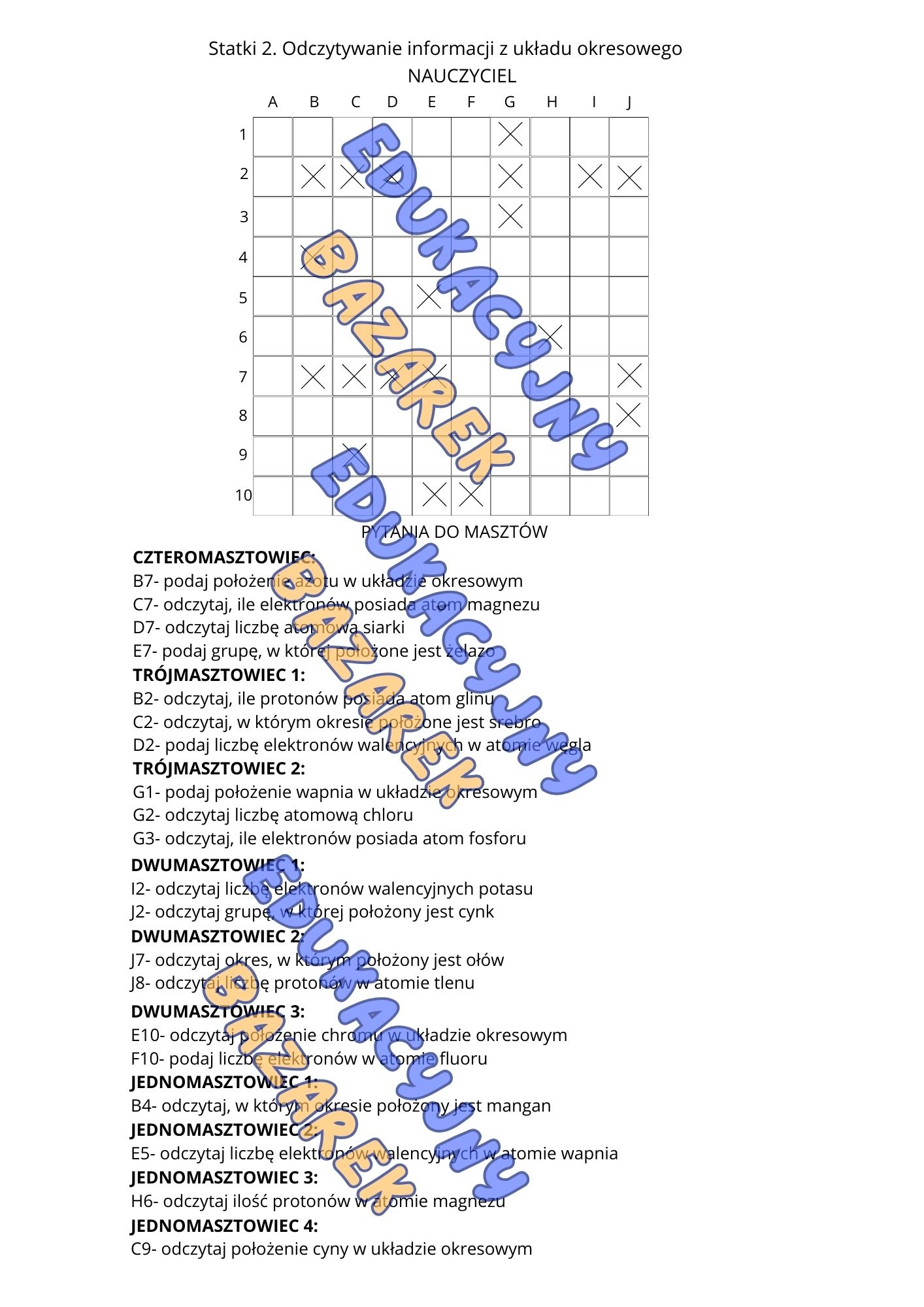 Zapraszam do gry w statki- odczytywanie informacji z układu okresowego. Idealna karta pracy do zabawy z całą klasą. W pakiecie otrzymujecie Państwo wzór planszy dla uczniów oraz swoją kartę z naniesionymi masztami. Nauczyciel może przerysować planszę bez statków na tablicy i rozpocząć zabawę. Jeśli grupa trafi w maszt otrzymuje pytanie do niego przypisane. Dopiero poprawna odpowiedź skutkuje zdobyciem masztu. Wygrywa grupa, która zdobędzie jak najwięcej masztów.