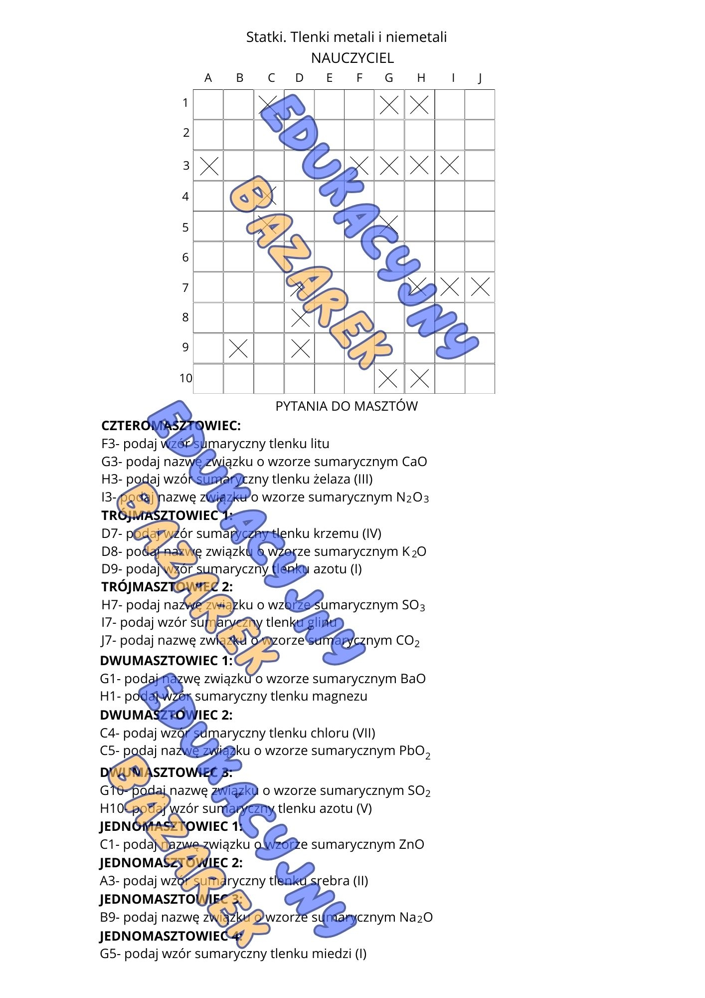Zapraszam do gry w statki- tlenki metali i niemetali. Idealna karta pracy do zabawy z całą klasą. W pakiecie otrzymujecie Państwo wzór planszy dla uczniów oraz swoją kartę z naniesionymi masztami. Nauczyciel może przerysować planszę bez statków na tablicy i rozpocząć zabawę. Jeśli grupa trafi w maszt otrzymuje pytanie do niego przypisane. Dopiero poprawna odpowiedź skutkuje zdobyciem masztu. Wygrywa grupa, która zdobędzie jak najwięcej masztów.